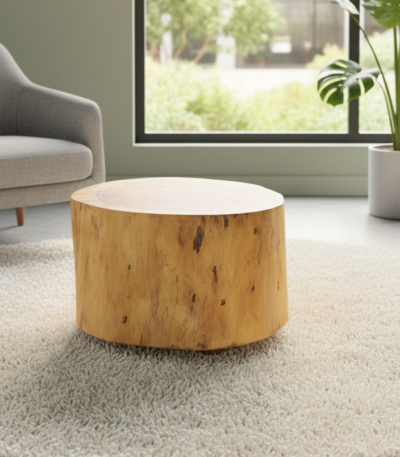 ₹22,000.00A handcrafted solid Monkeypod wood coffee table featuring a cylindrical log-form body, smooth matte finish, and hidden castors for easy movement. With a 60 cm diameter and 40 cm height, it offers a compact yet bold natural centerpiece for living rooms, lounges, or flexible seating spaces.