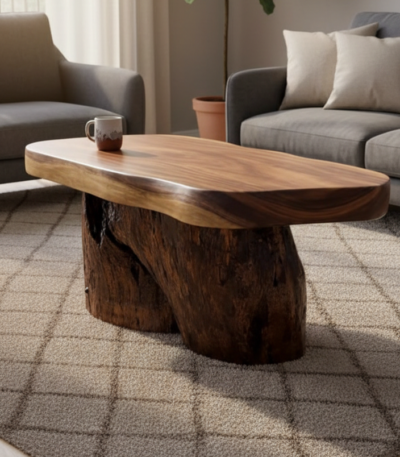 ₹28,000.00A handcrafted solid Monkeypod wood coffee table featuring a natural live-edge slab top, sculptural trunk-style base, and smooth matte finish. With a 92 × 61 cm top and 46 cm height, it offers a bold organic presence ideal for living rooms, lounges, or nature-inspired interiors.