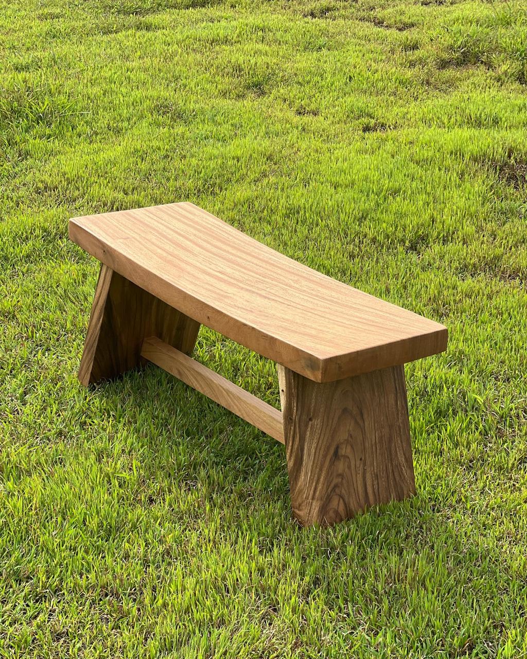 A handcrafted solid Monkeypod wood bench featuring a clean plank-style seat, angled wooden legs with support stretcher, and smooth matte finish. With a compact 122 × 41 cm size, this 2-seater offers sturdy everyday seating with a simple natural wood aesthetic for dining areas, entryways, or outdoor patios.