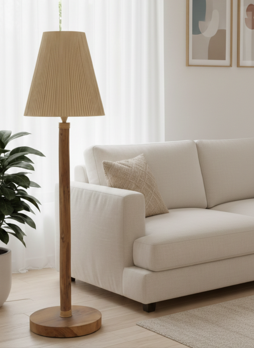 The Arbor Glow Teak Floor Lamp is crafted from premium solid teak wood, known for its durability, rich grain patterns, and long-lasting strength. Designed with a refined matte finish, the natural wood texture remains visible, giving the lamp an organic and sophisticated presence. At 5 feet in height, it offers balanced proportions — tall enough to create a statement, yet subtle enough to blend seamlessly into contemporary interiors.The wide fabric shade diffuses light softly, creating a warm, calming ambiance ideal for living rooms, reading corners, bedrooms, resort villas, and lounge spaces. The solid circular base ensures stability, while the clean vertical teak column highlights the beauty of natural wood craftsmanship. Every piece carries unique grain variations, making each lamp one of a kind. Minimal in design, timeless in appeal, and functional in purpose — the Arbor Glow Teak Floor Lamp is where natural material meets modern elegance.