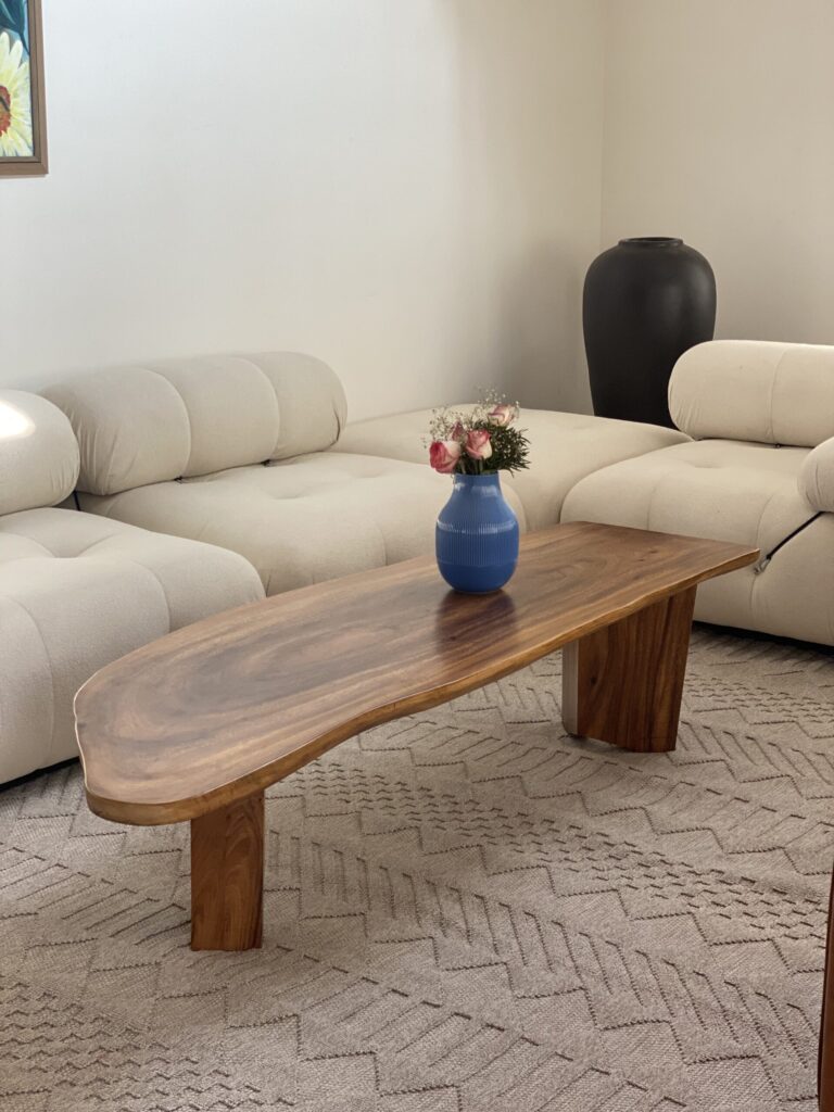 The Live Edge Monkeypod Wood Center Table (3×3 ft) is a handcrafted solid wood coffee table designed to bring natural warmth and character into modern living spaces. Made from premium Monkeypod wood, the tabletop highlights flowing grain patterns and subtle organic edges, ensuring every piece carries a unique visual identity. The sturdy sculpted wooden base provides strong support while maintaining a grounded, architectural look. Finished in a smooth matte coat, the surface enhances the natural tone and texture of the wood while remaining practical for everyday use. With its generous 92 × 92 cm size, this center table works perfectly as a focal piece for living rooms, lounge areas, studio spaces, or reception seating zones.