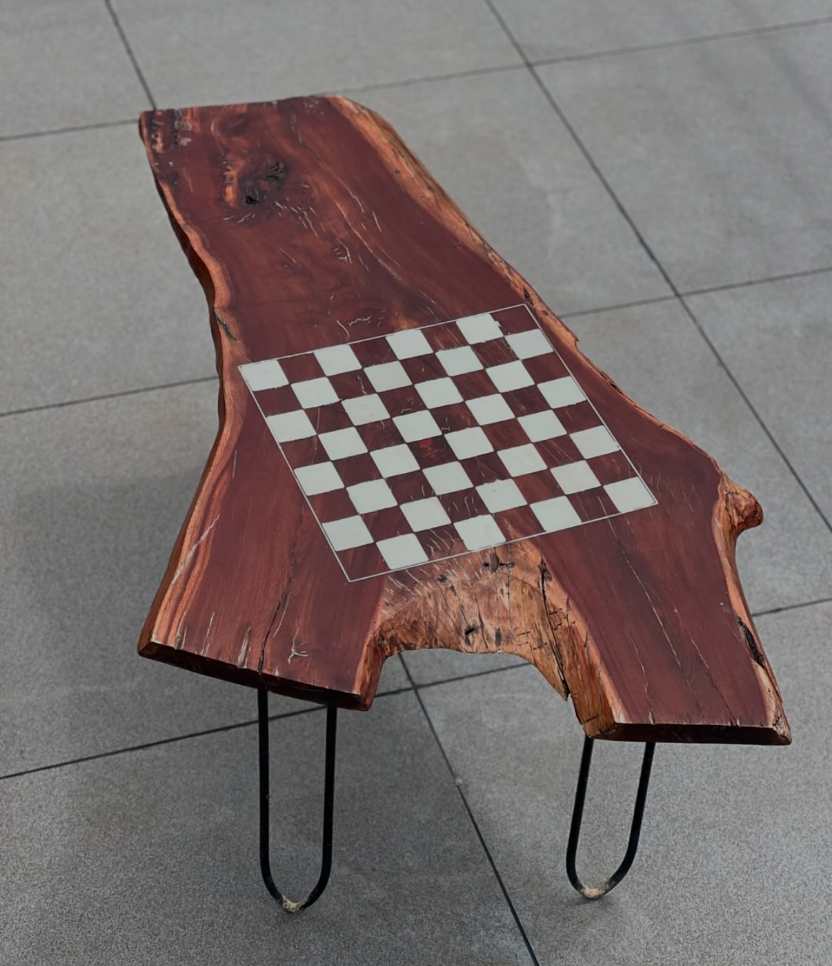 A handcrafted live-edge Monkeypod wood chess coffee table with a smooth matte finish, featuring an integrated chessboard and compact 76×40 cm top. Designed as a functional statement table for living rooms, studios, and lounge spaces.