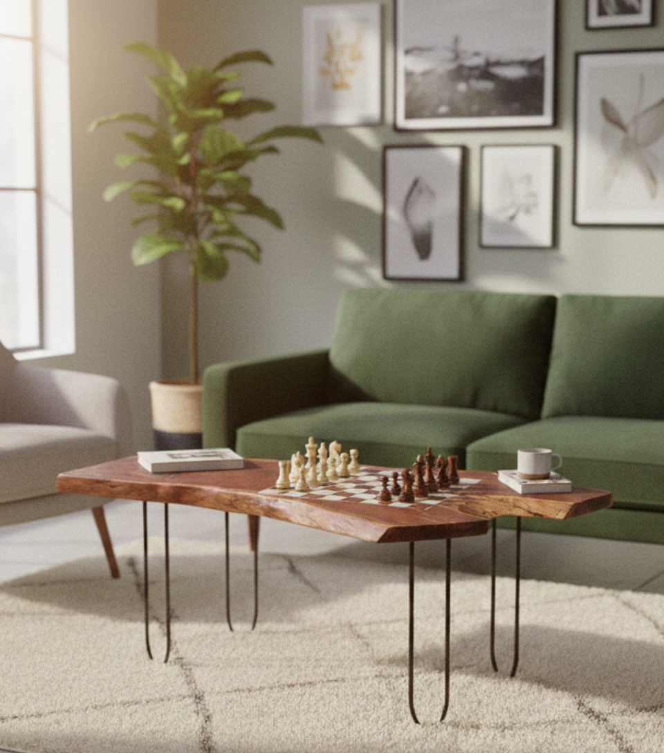 The Live-Edge Monkeypod Wood Chess Coffee Table is a handcrafted solid wood piece that blends natural artistry with functional design. Made from premium Monkeypod wood, the tabletop preserves the organic live edges and rich natural grain, ensuring every table carries its own unique character. At the center, a built-in chessboard adds an interactive element, transforming the table into both a décor highlight and a leisure feature. The smooth matte finish enhances the natural tone of the wood while protecting the surface for daily use. Supported by sturdy minimalist metal hairpin legs, the table maintains a light modern profile while offering reliable stability. With its 76 × 40 cm size and 40 cm height, it works perfectly as a compact coffee table for living rooms, creative studios, reading corners, lounges, or casual seating areas.