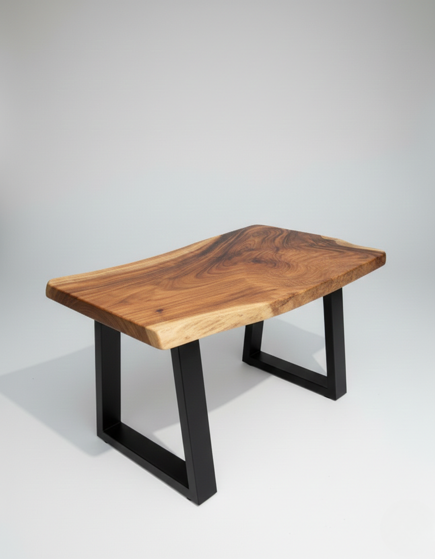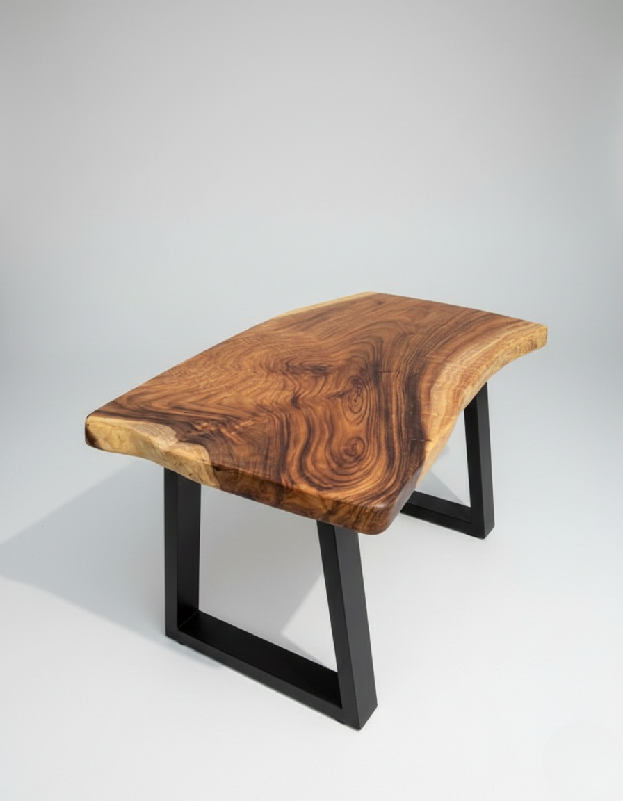 The Live Edge Monkeypod Wood Dining Table (4 Seater) is a handcrafted solid wood slab table created to showcase the natural character of real timber. Made from premium Monkeypod wood, the tabletop preserves organic edges and distinctive grain movement, ensuring each piece is visually unique. Sized at 137 × 76 cm, this compact dining table comfortably suits four people, making it ideal for apartments, small dining rooms, cafés, or studio spaces. The matte finish enhances the natural tone of the wood while maintaining a smooth and practical everyday surface. Supported by a durable metal base, the table combines natural warmth with modern structural strength offering long-term stability along with a clean contemporary look.