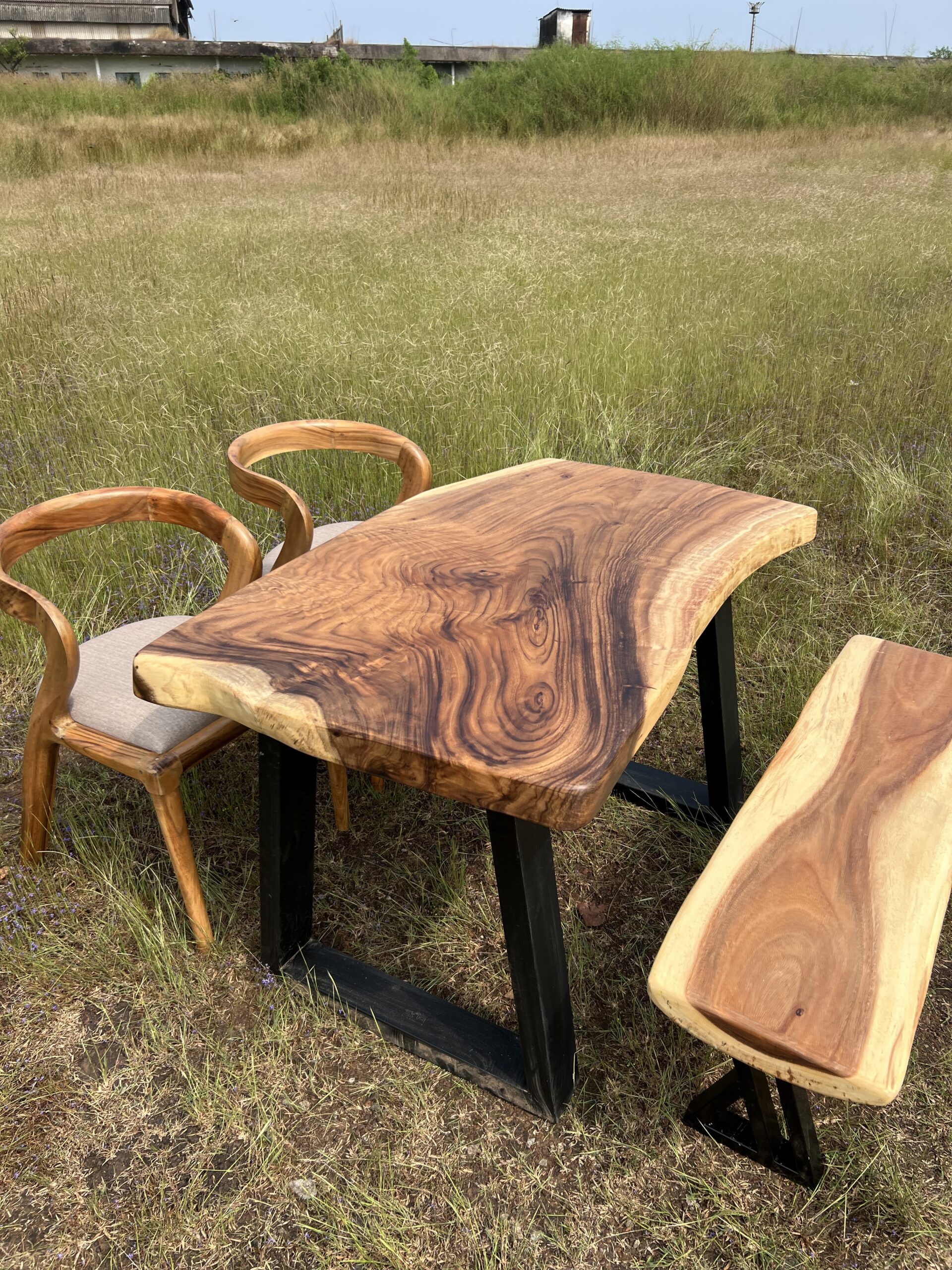 A compact solid Monkeypod wood live-edge dining table with a natural slab top and matte finish, supported by a sturdy metal base. Designed as a stylish 4-seater for modern dining spaces.