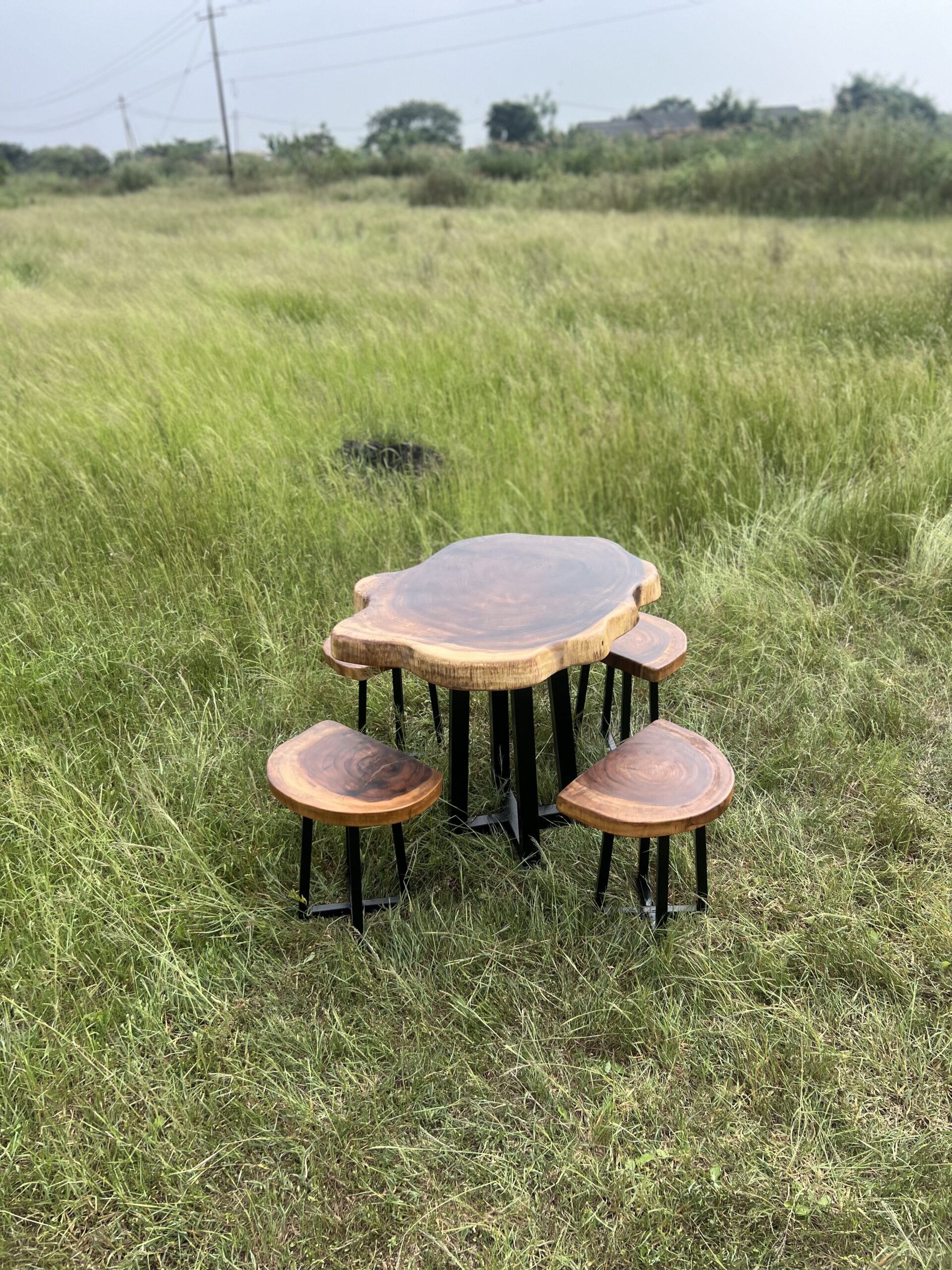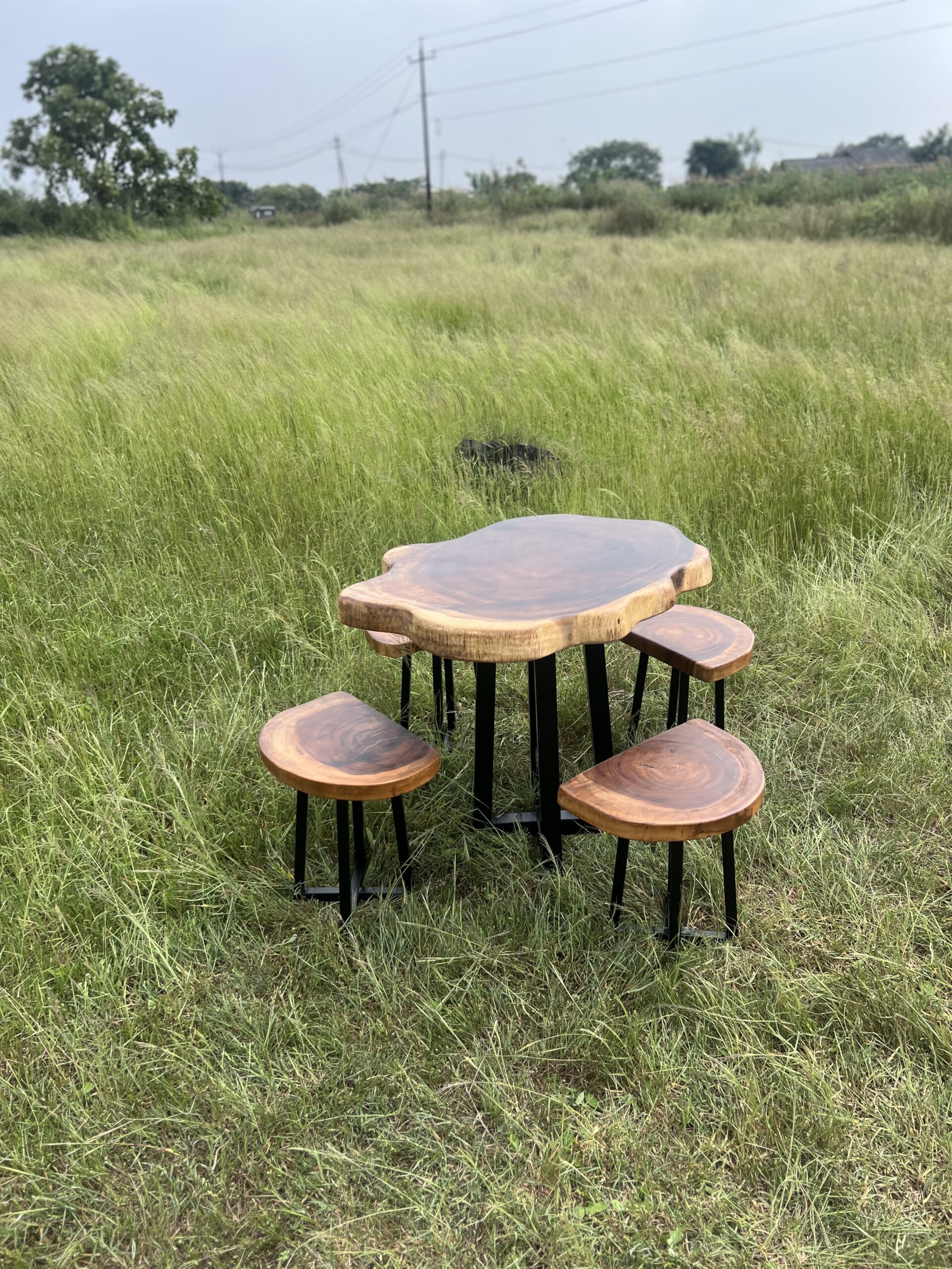 A compact solid Monkeypod wood live-edge round table set with matte finish and matching stools. Designed as a natural 4-seater for cozy dining, balconies, or casual seating spaces.