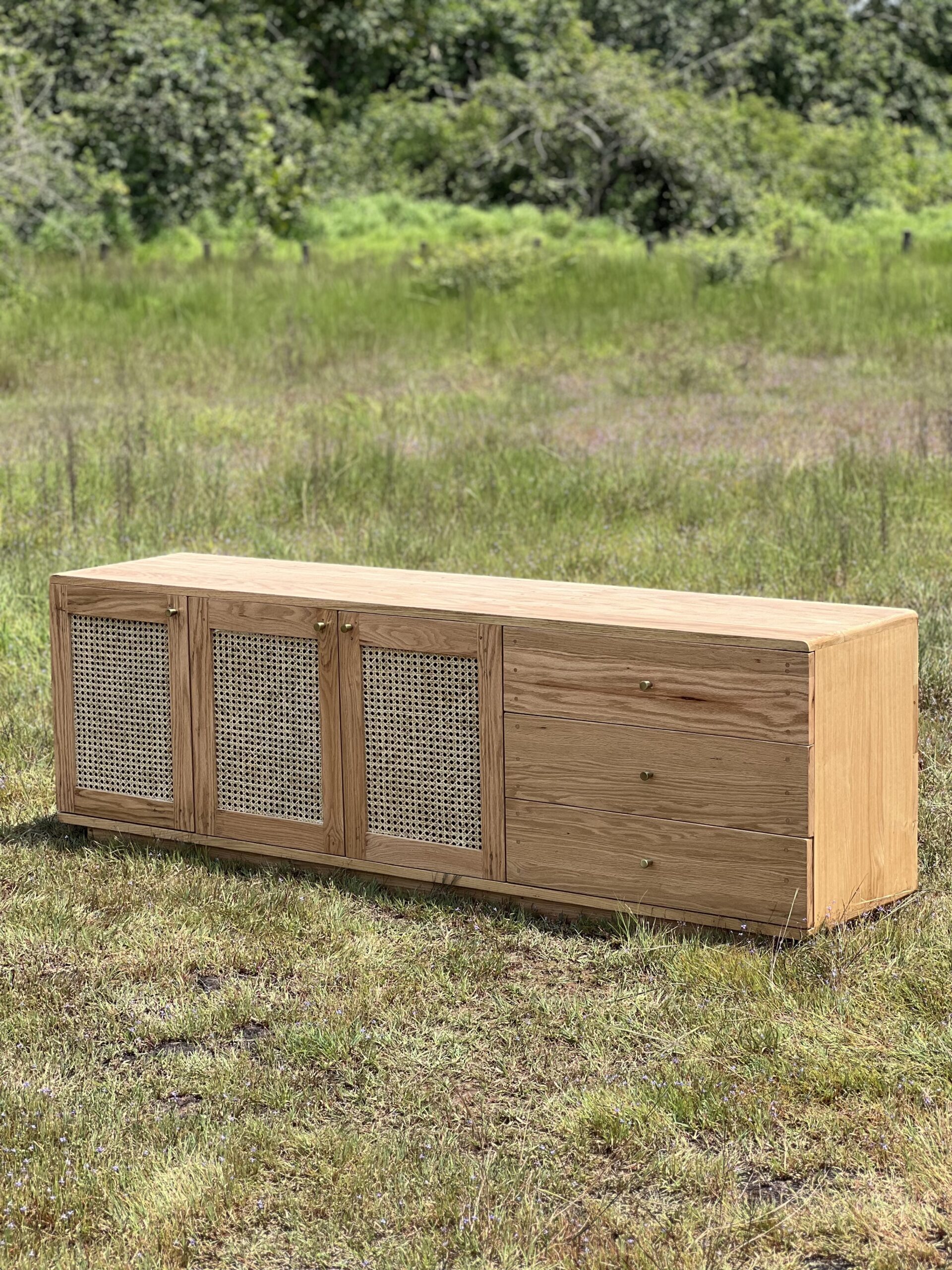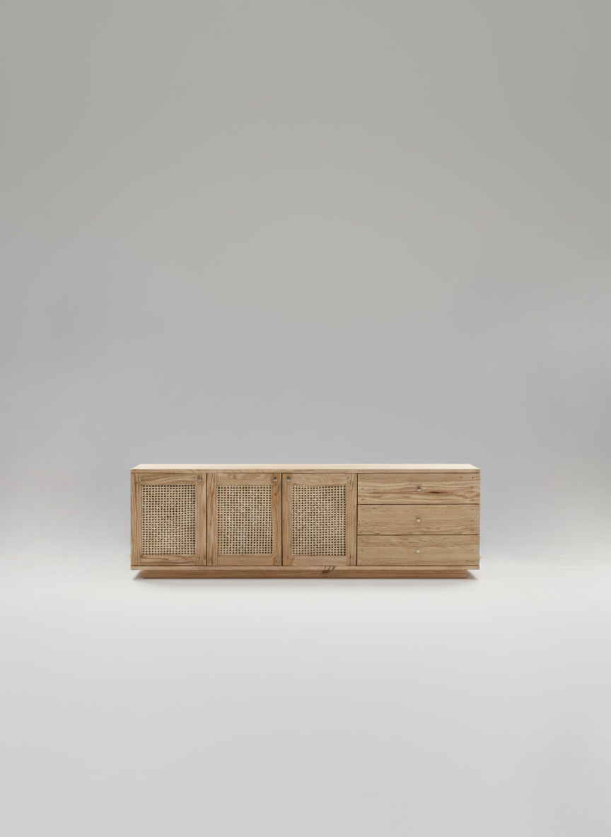 A handcrafted solid Oak wood console featuring woven cane panel doors, integrated drawers, and a smooth matte finish. With a spacious 214 × 51 cm size and 61 cm height, it offers practical storage with a warm natural aesthetic for living rooms, hallways, or dining spaces.
