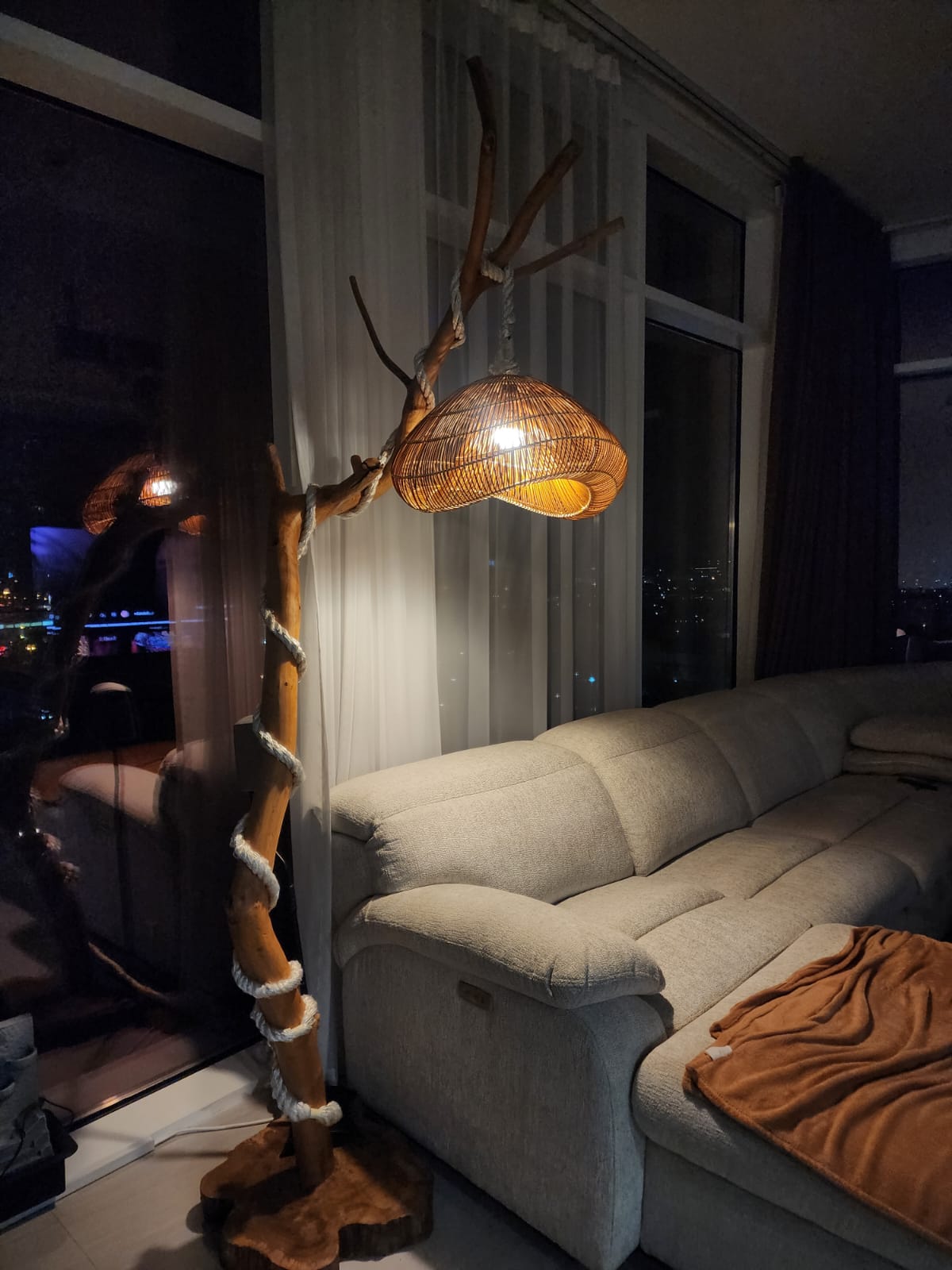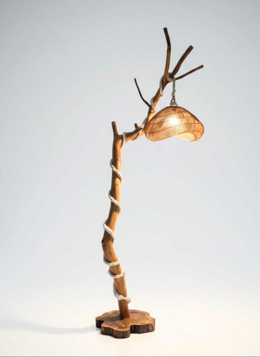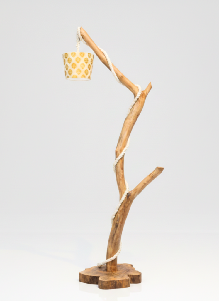 A handcrafted teak wood floor lamp made from a natural tree branch, featuring rope detailing and a smooth matte finish. Standing 7 feet tall, it creates a striking organic sculptural presence while providing warm ambient lighting for living rooms, bedrooms, villas, resorts, or lounge spaces.