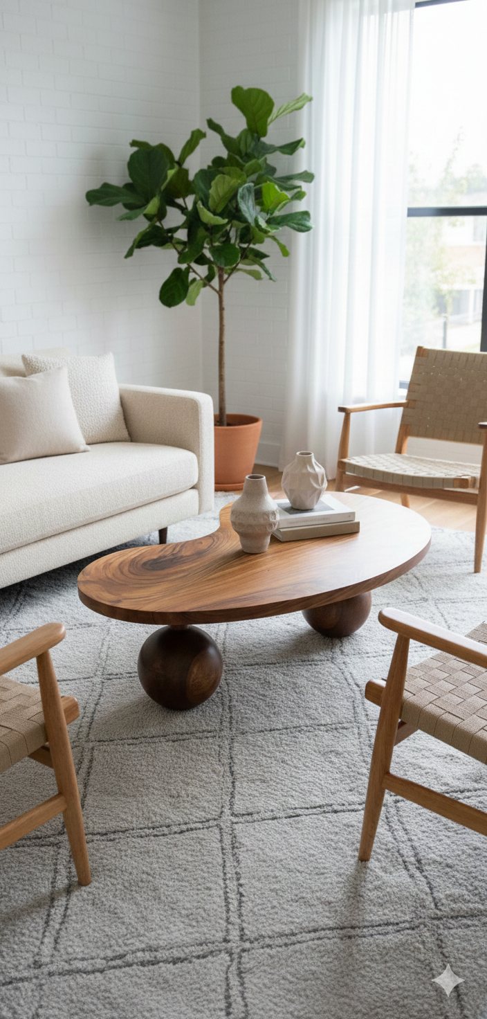 The Monkeypod SculptTop Coffee Table is a handcrafted solid wood centerpiece designed to blend natural timber beauty with sculptural contemporary form. Made from premium Monkeypod wood, the table highlights rich flowing grain patterns and warm natural tones, ensuring each piece carries subtle visual uniqueness. Its distinctive sculpted organic top softens the table’s silhouette while providing a generous 106 × 106 cm surface for everyday use. The rounded solid wooden pedestal legs add stability and a balanced architectural presence, enhancing both durability and visual character. A smooth matte finish protects the surface while preserving the authentic warmth and tactile quality of the wood. Standing at a comfortable 46 cm height, this coffee table works perfectly as a living room centerpiece, lounge feature, or statement piece in contemporary, minimalist, or nature-inspired interiors where handcrafted solid wood furniture defines the space.