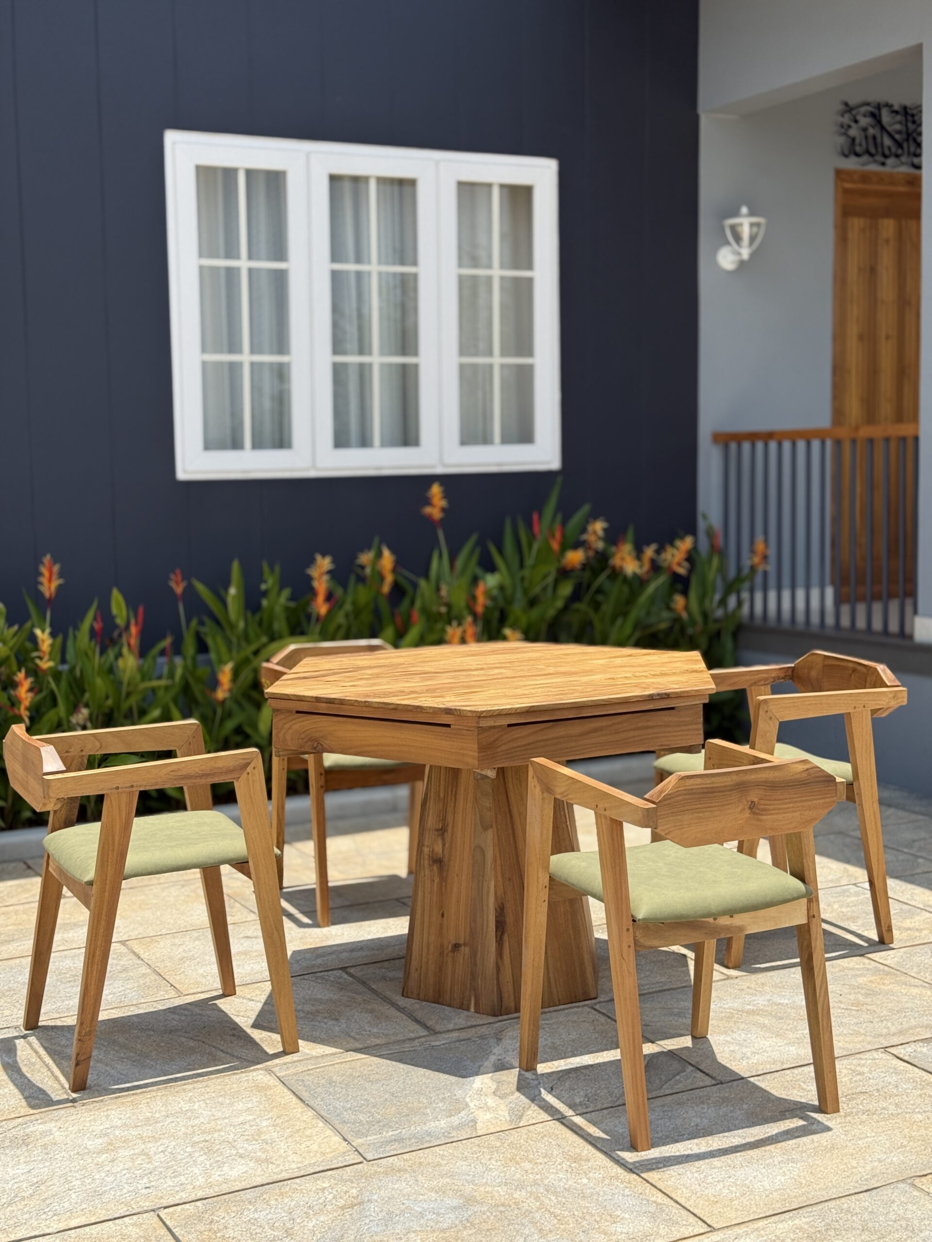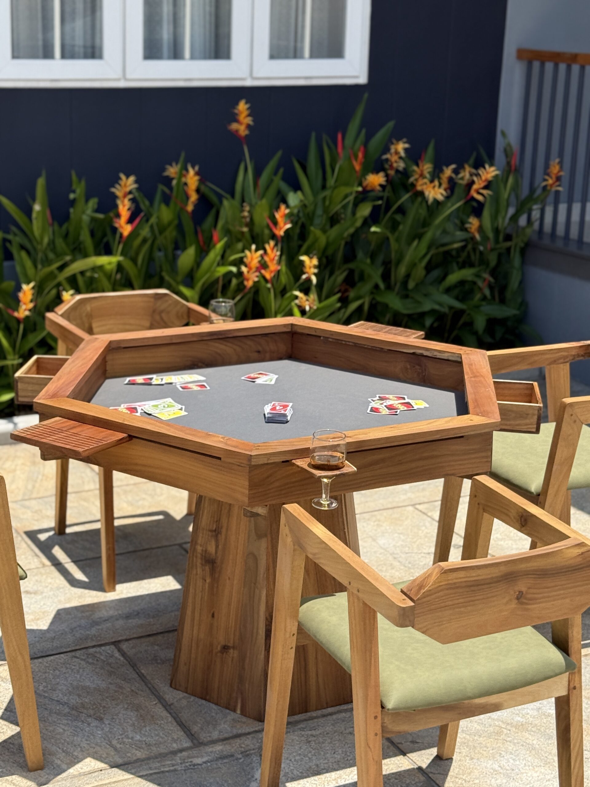 The Solid Acacia Wood Convertible Hexagon Game & Dining Table is a handcrafted multi-function table designed for both entertainment and everyday use. Built from premium solid Acacia wood, the table highlights natural grain detail and strong hardwood durability. The hexagonal design features six equal sides measuring 122 cm each, creating a balanced layout for group seating. The convertible top allows the table to switch between a felt gaming surface for cards or board games and a flat wooden surface suitable for dining or social gatherings. Finished in a smooth matte coat, the table maintains its natural wood character while providing a practical and durable surface. Ideal for homes, villas, game rooms, and leisure spaces, this table combines functionality, craftsmanship, and standout design.