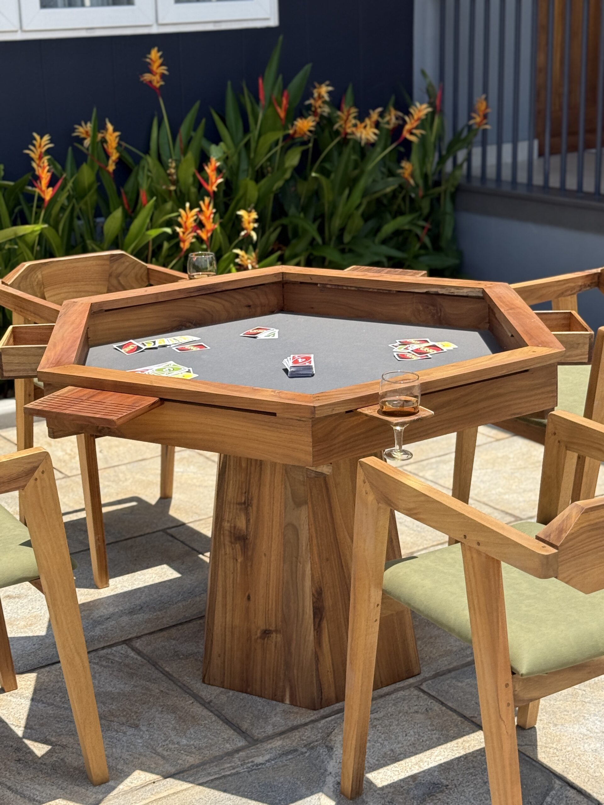 A solid Acacia wood hexagon convertible table with a dual-purpose top for gaming and dining. Matte finished and designed for cards, board games, and stylish gathering spaces.