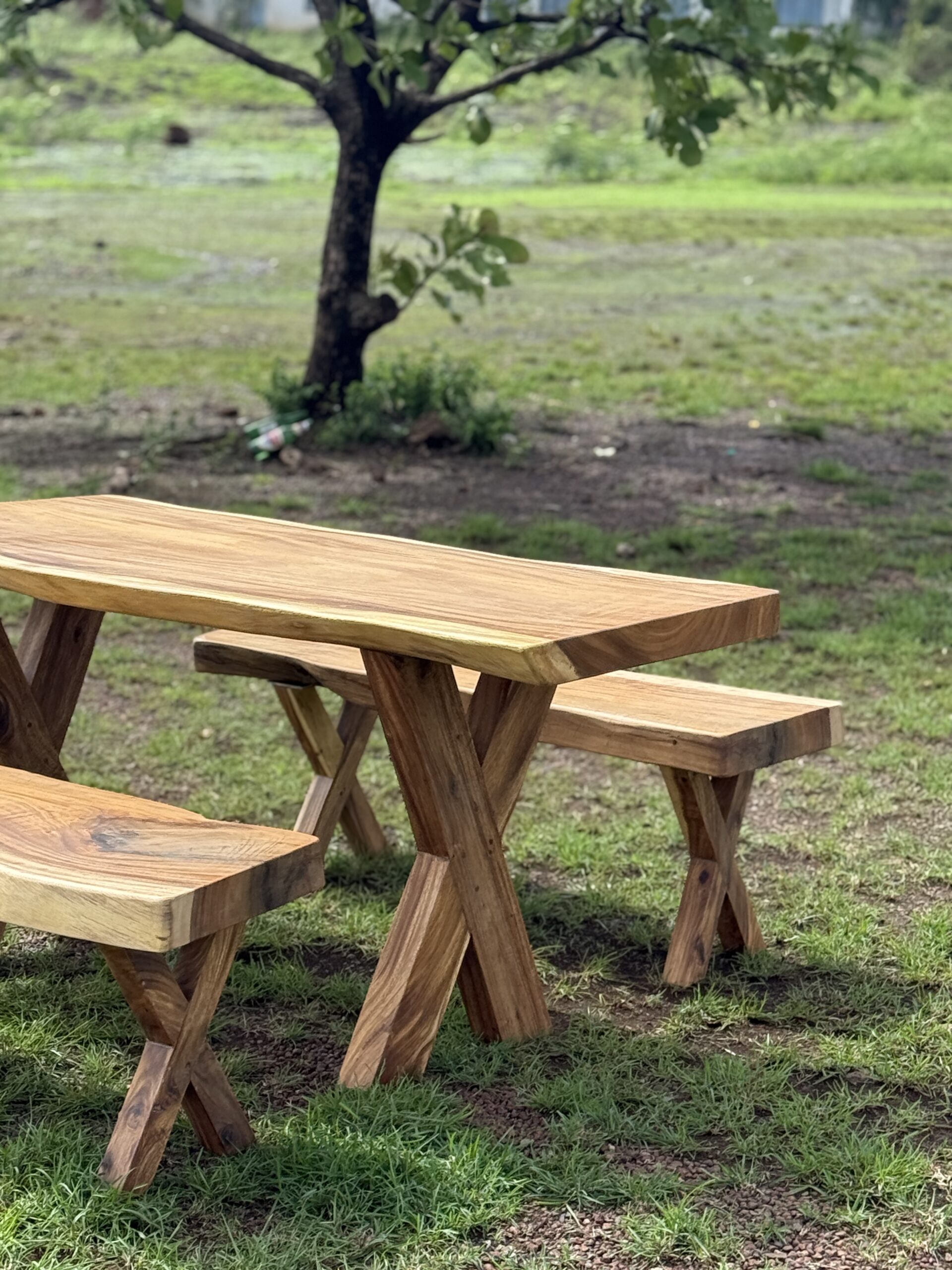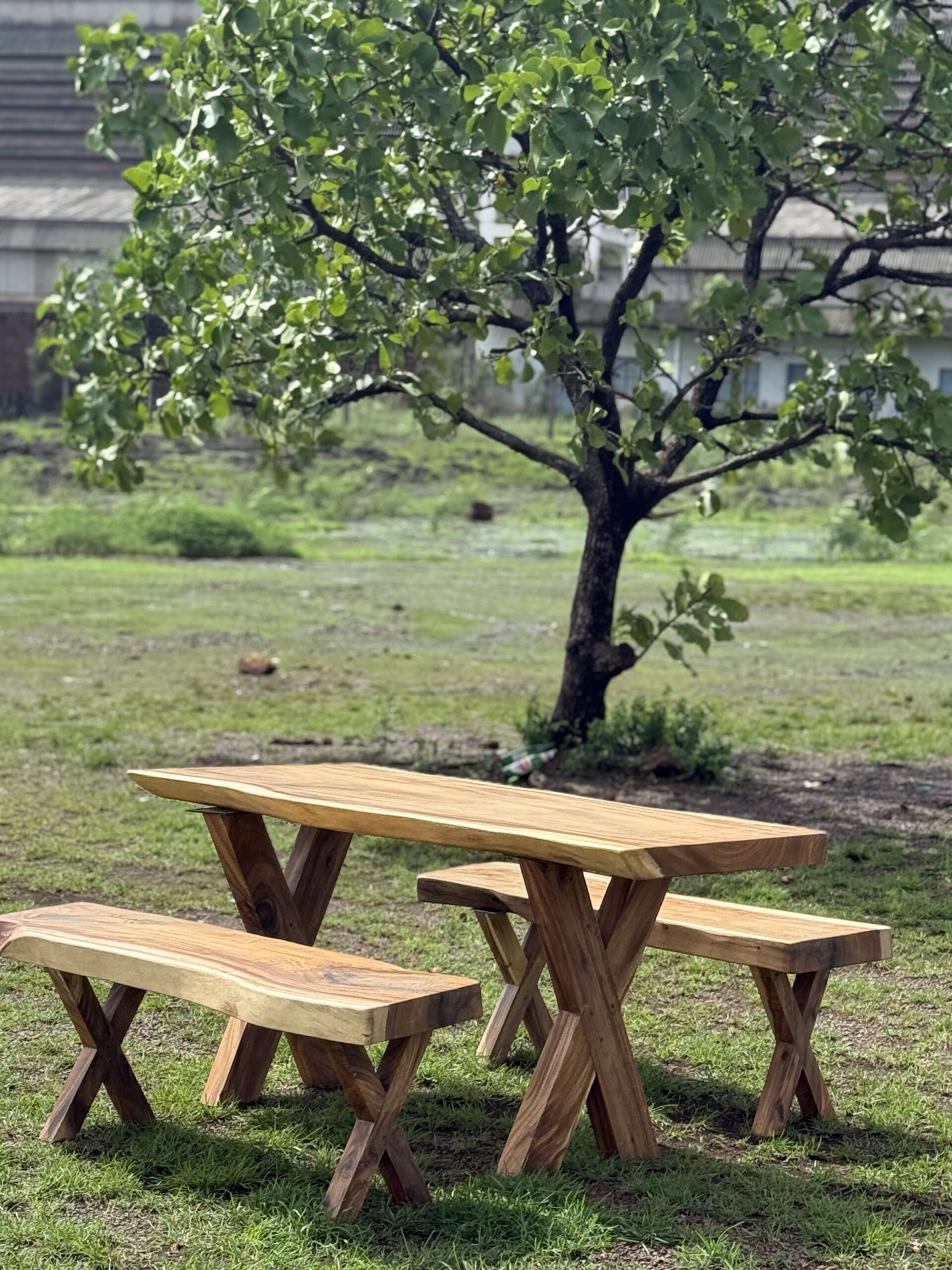 The Solid Monkeypod Wood Dining Table Set with Bench (6×3 ft) is a heavy duty handcrafted furniture piece made for long-term use and natural visual appeal. Built from premium solid Monkeypod wood, the table features a thick 3-inch top that highlights rich grain patterns and organic character.The matte finish preserves the raw texture and tone of the wood while providing a smooth, practical surface for daily dining. Paired with matching solid wood benches, this set delivers both strength and comfort, making it ideal for homes, villas, resorts, and outdoor covered dining areas.Each set is individually crafted, ensuring unique wood patterns and a sturdy structural build that stands apart from factory made furniture.