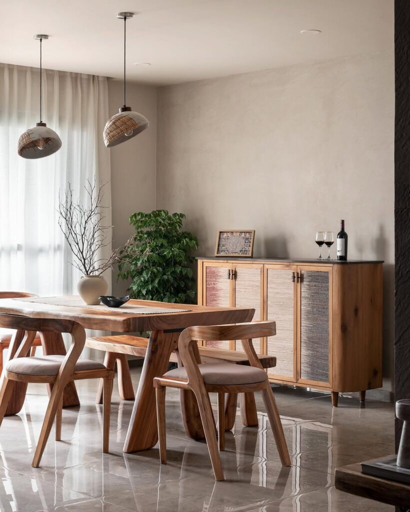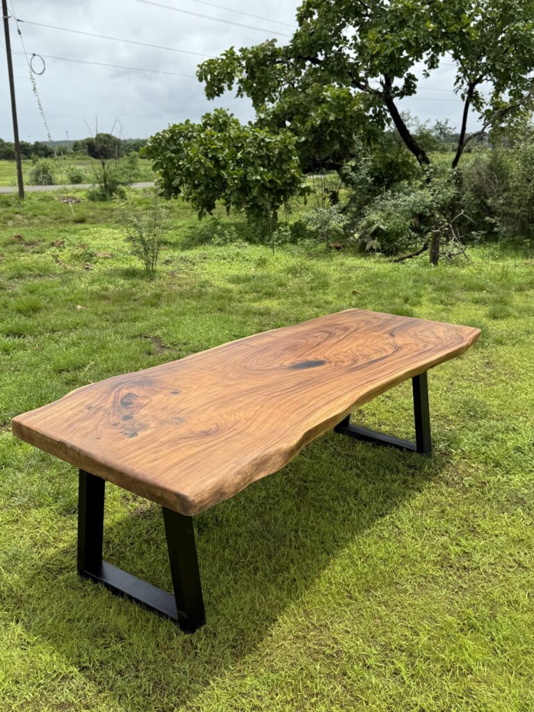 The Solid Monkeypod Wood Dining Table Set with Chairs (6×3 ft) combines natural hardwood character with a modern structural base. Crafted from premium solid Monkeypod wood, the tabletop features a thick 3-inch slab that showcases bold grain patterns and natural variations, making each piece unique. Finished in a smooth matte coat, the surface maintains the authentic look of the wood while remaining practical for everyday use. The table is supported by a durable metal leg frame that adds stability and a contemporary industrial touch.Paired with matching wooden chairs, this dining set is ideal for modern homes, villas, and designer dining areas that demand both strength and visual presence.