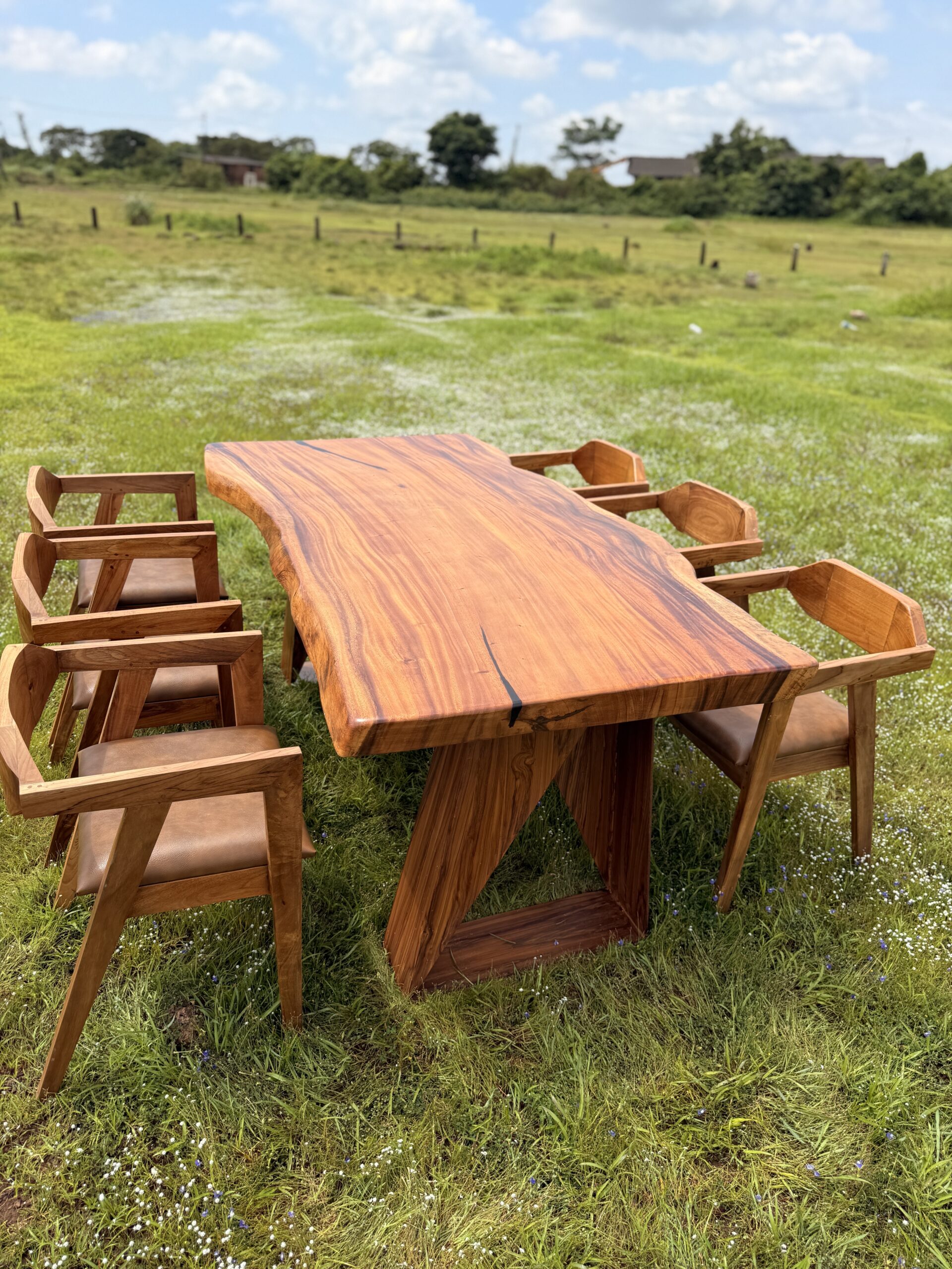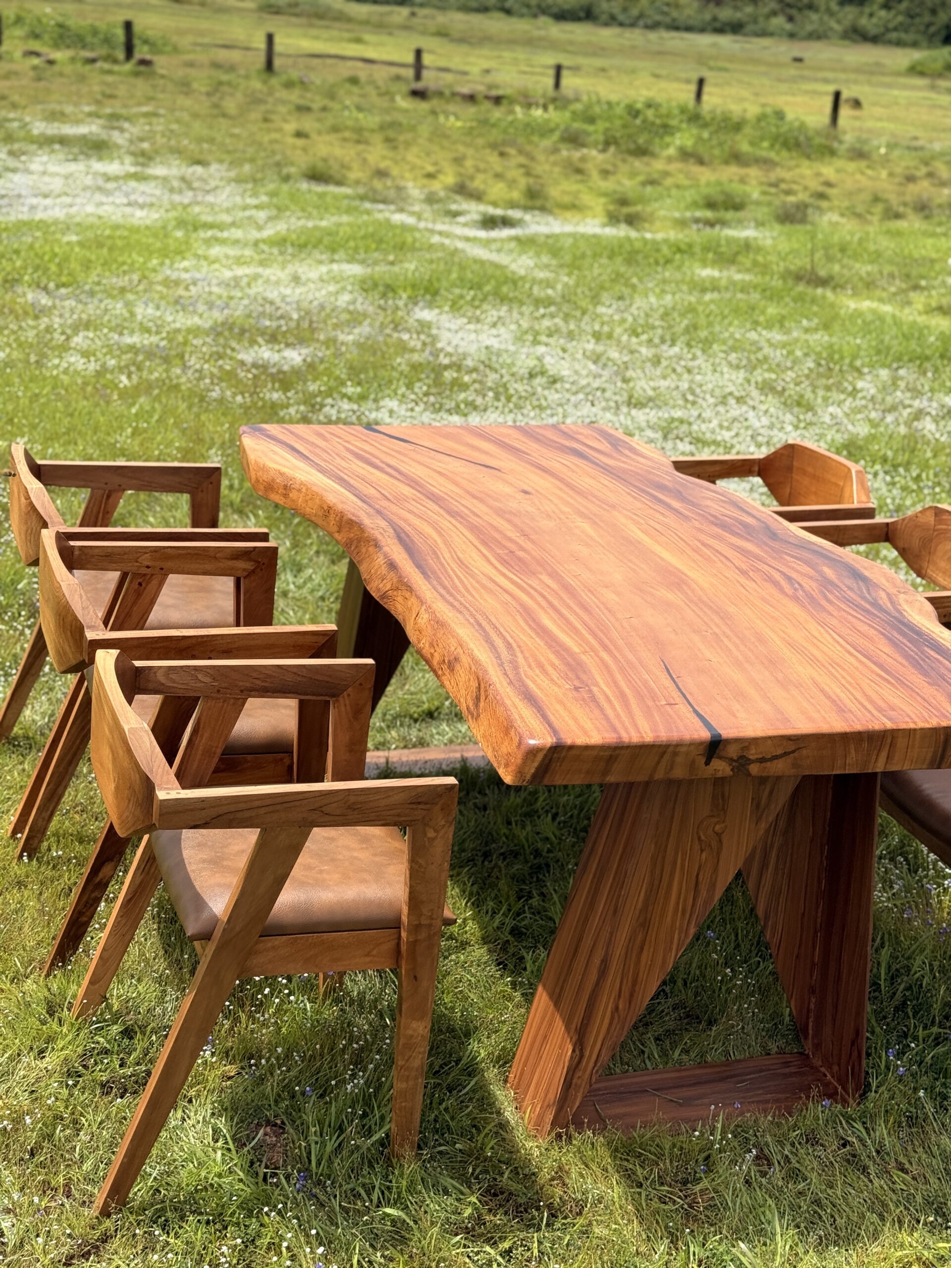 A solid Monkeypod wood dining table set with chairs, featuring a 3-inch thick slab top and matte finish, supported by a strong metal leg base. Built for modern dining spaces that need both durability and design impact.