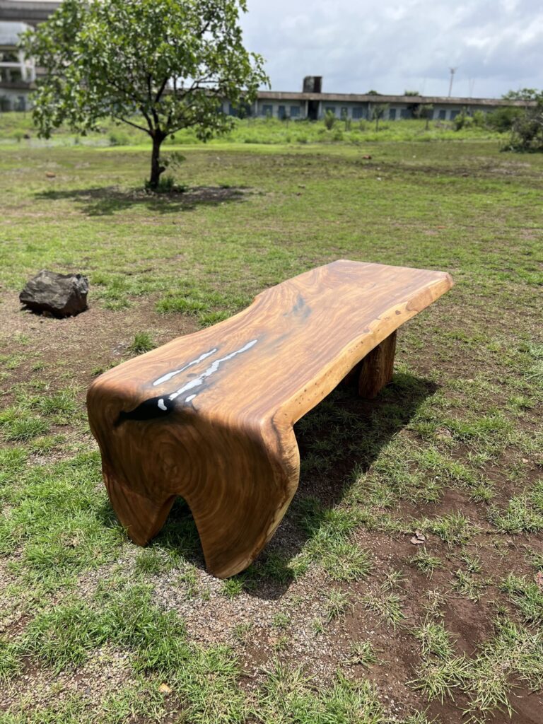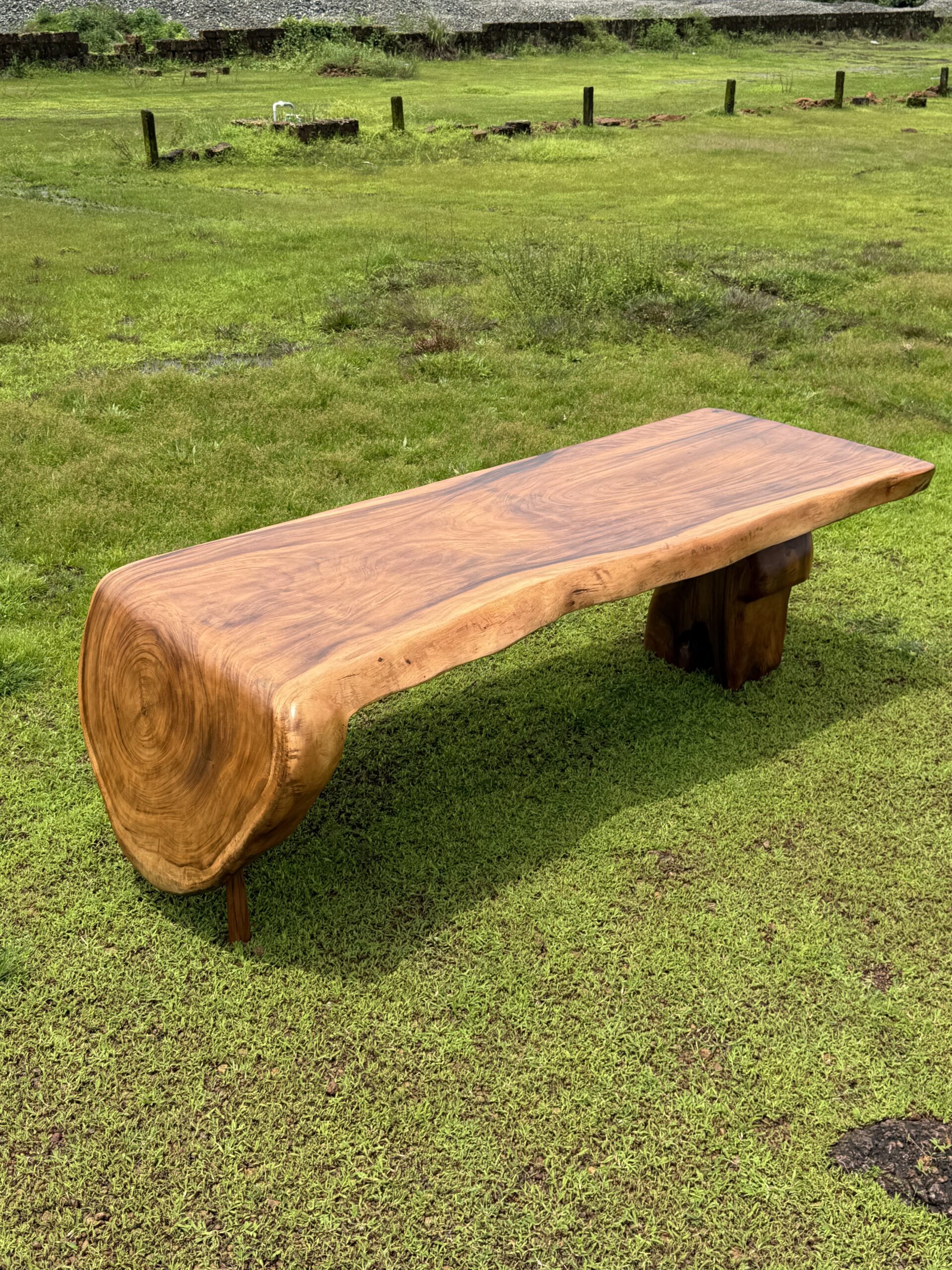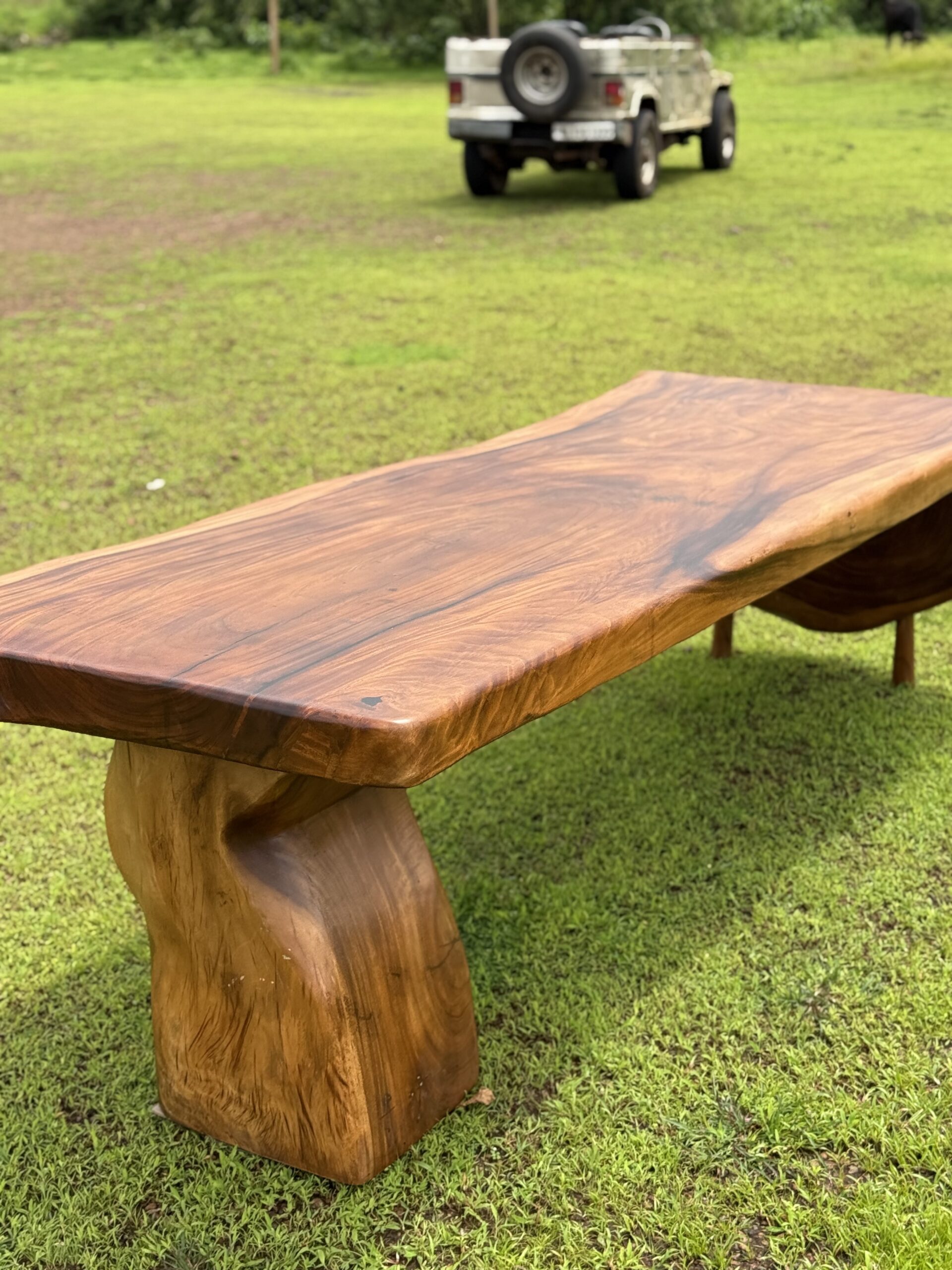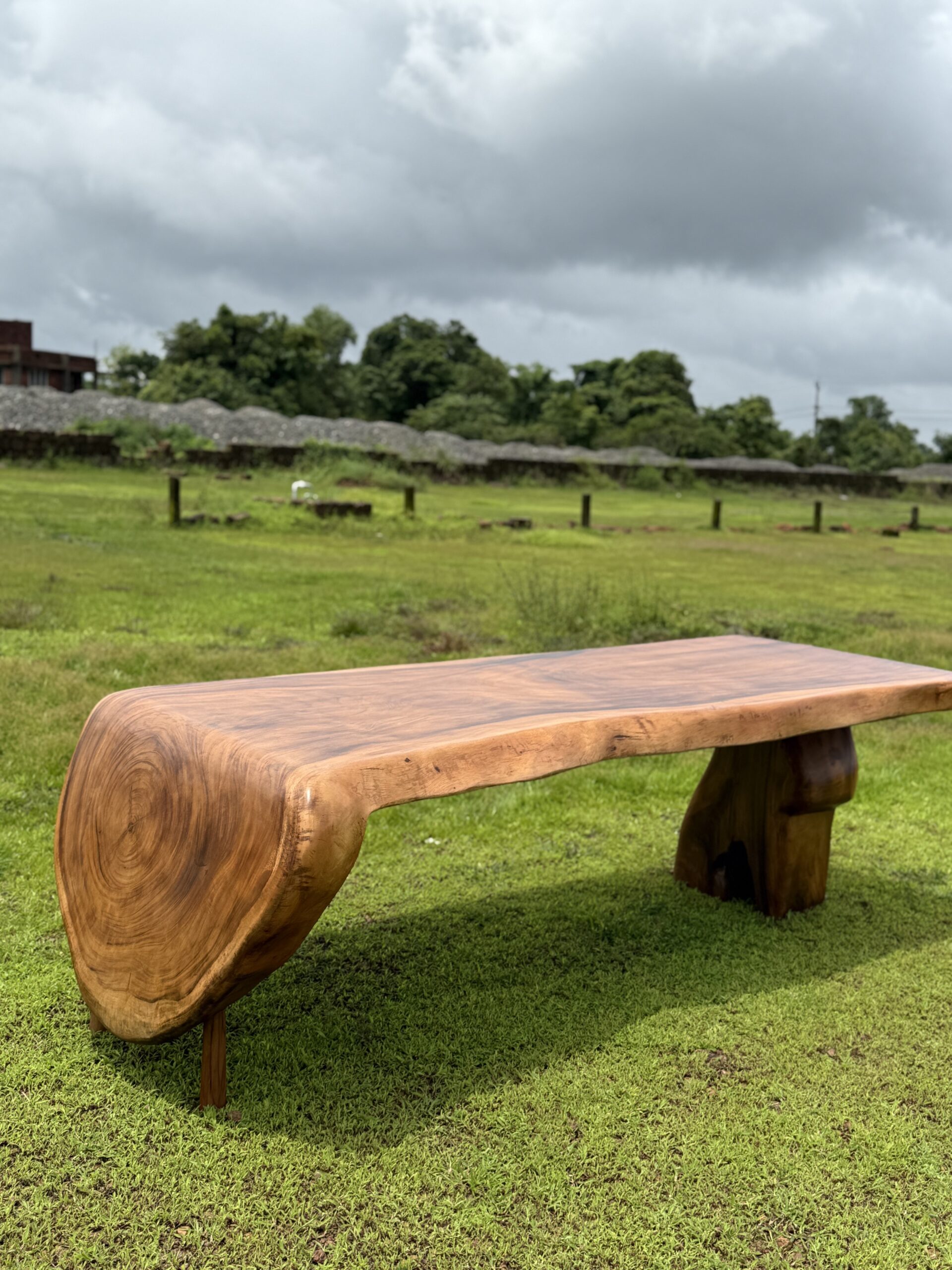 The Solid Monkeypod Wood Floating Dining Table (8×3 ft) is a sculptural slab table designed to stand out in premium dining interiors. Crafted from solid Monkeypod wood,the thick continuous slab highlights natural grain flow, organic edges, and dramatic end-cut detailing that gives the table a floating visual effect. The matte finish enhances the raw tone and texture of the wood while keeping the surface smooth and usable for daily dining. The custom wooden support structure provides strong load-bearing stability without distracting from the slab’s natural form. Ideal for luxury homes, villas, and designer dining rooms, this table functions as both a dining surface and a conversation piece.