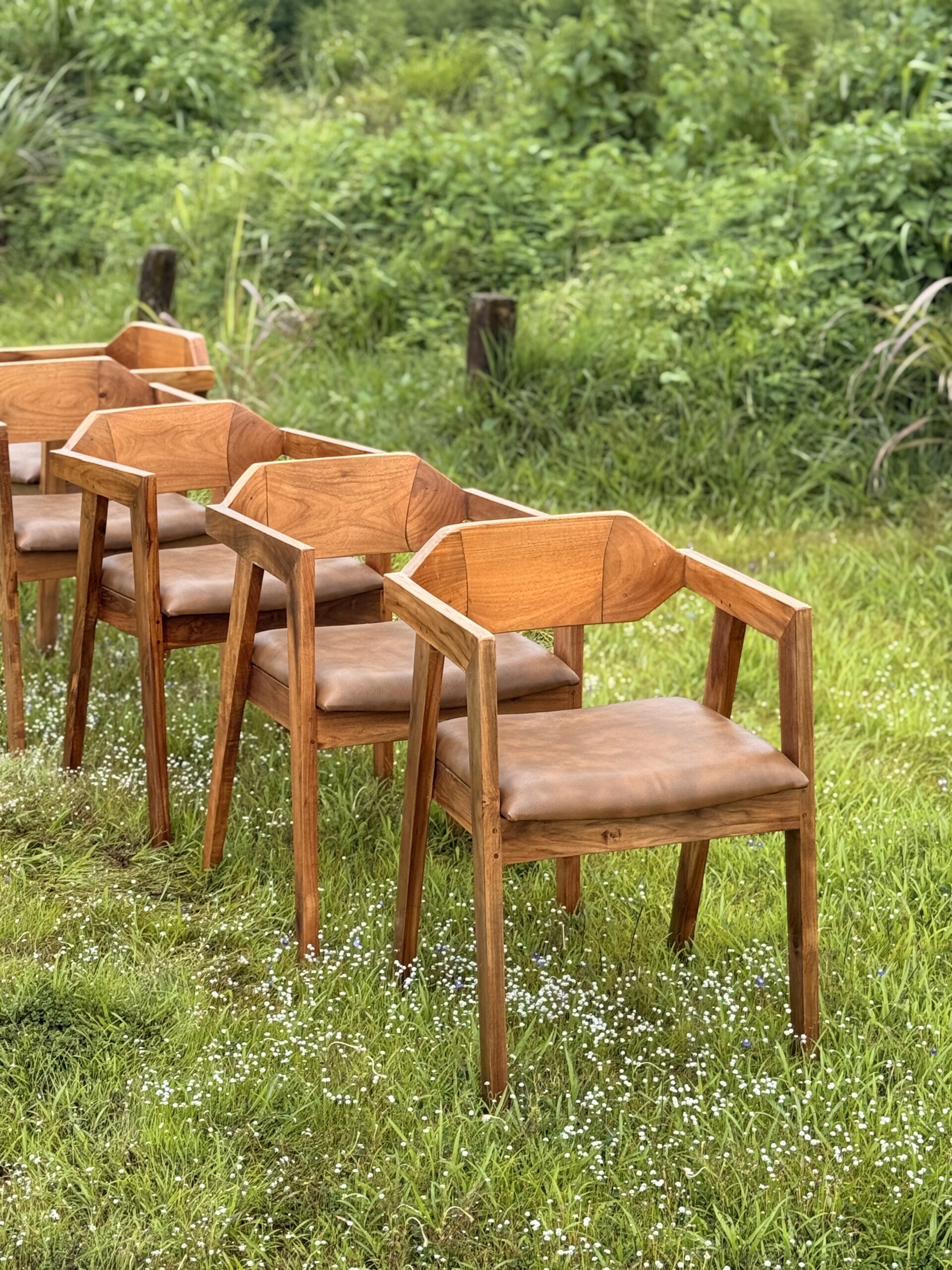 The Teak Facet Dining Armchair is a handcrafted solid wood seating piece designed to showcase both structural strength and contemporary geometric design. Made from premium Acacia wood, the chair highlights rich natural grain patterns and warm timber tones, ensuring each piece carries its own subtle uniqueness. Its distinctive faceted back panel and integrated armrests create a strong architectural silhouette while providing supportive, comfortable seating. The smooth matte finish protects the wood while preserving its natural texture and authentic handcrafted character. Built on a sturdy solid wooden frame with a comfortable 46 × 46 cm seat, the chair offers reliable everyday usability along with a refined sculptural presence. Ideal for dining rooms, workspaces, cafés, or modern rustic interiors, it functions as both a practical seating solution and a design-forward furniture piece.