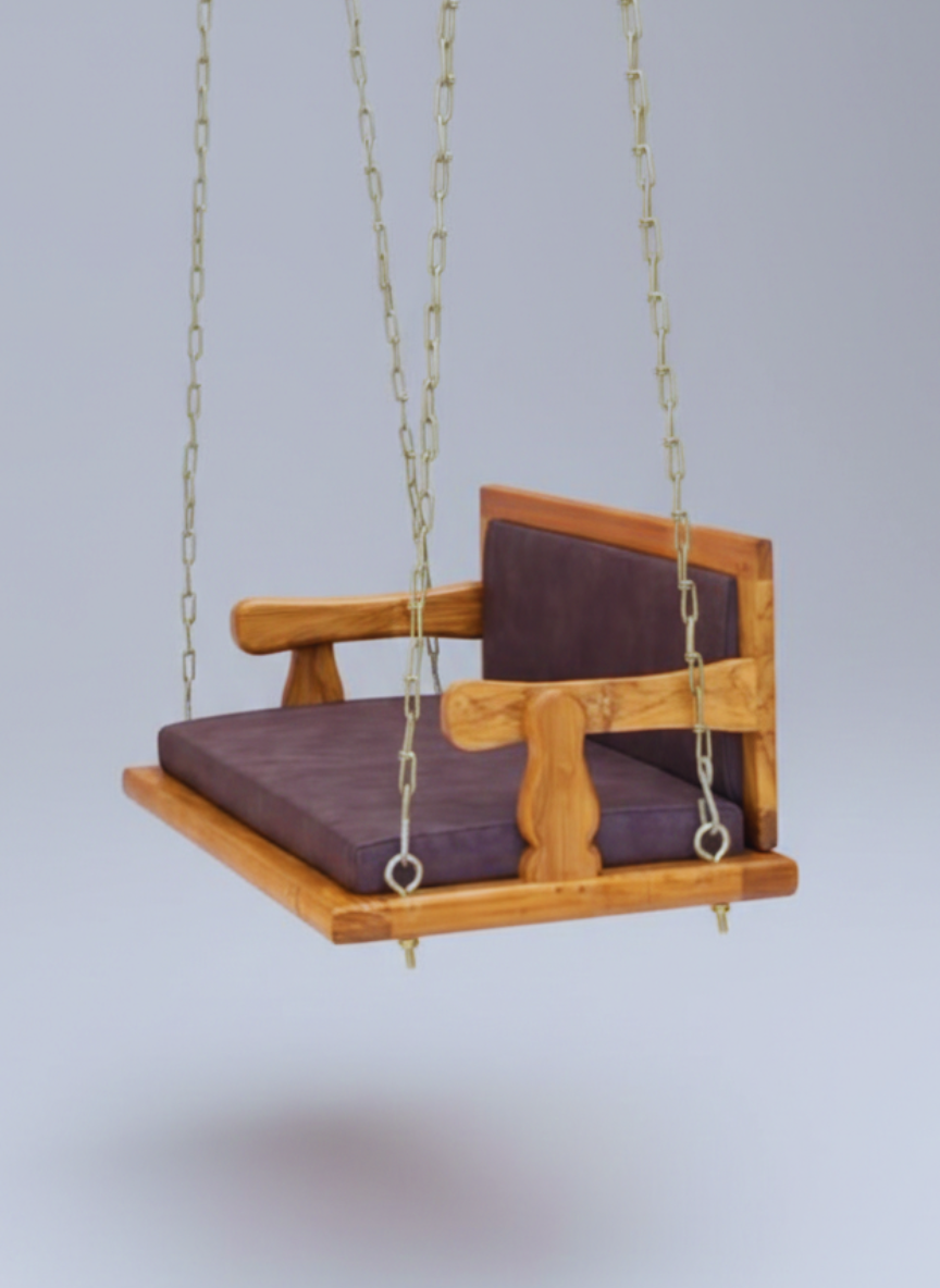 The Teak FlipBack Cushion Swing is a handcrafted solid wood hanging seat designed to combine structural durability with versatile comfort. Made from premium Teak wood, the swing highlights rich natural grain patterns and warm tones, ensuring long-lasting strength and subtle uniqueness in every piece. Its distinctive reversible flip-backrest allows the back support to switch to either side, enabling flexible seating orientation and relaxed lounging positions. The cushioned seat and back panel provide enhanced comfort, while the sturdy wooden frame and heavy-duty chain suspension ensure reliable stability for daily use. A smooth matte finish protects the wood while preserving its natural texture and handcrafted appeal. With its practical 122 × 61 cm size, this swing works perfectly for balconies, patios, verandas, resorts, or indoor lounge corners where adaptable seating and solid wood craftsmanship create a comfortable, inviting atmosphere.