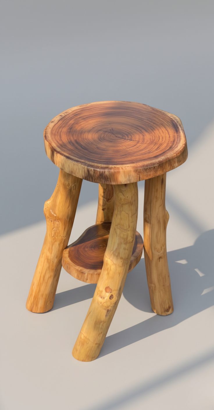 The Monkeypod TimberRoot Solid Wood Stool is a handcrafted piece designed to showcase the raw beauty and strength of natural Monkeypod wood. The round solid wood top highlights rich natural grain patterns, giving each stool a unique organic character. Supported by thick, naturally contoured wooden legs, the stool offers excellent stability while maintaining a rustic sculptural look inspired by forest forms. The smooth matte finish protects the wood surface while preserving its natural warmth and texture for everyday use. With its 50×35 cm size and 18 cm low height, this piece functions perfectly as a compact seating stool, side table, lounge accent, or decorative wooden element in living rooms, studios, cafés, or nature-inspired interiors.