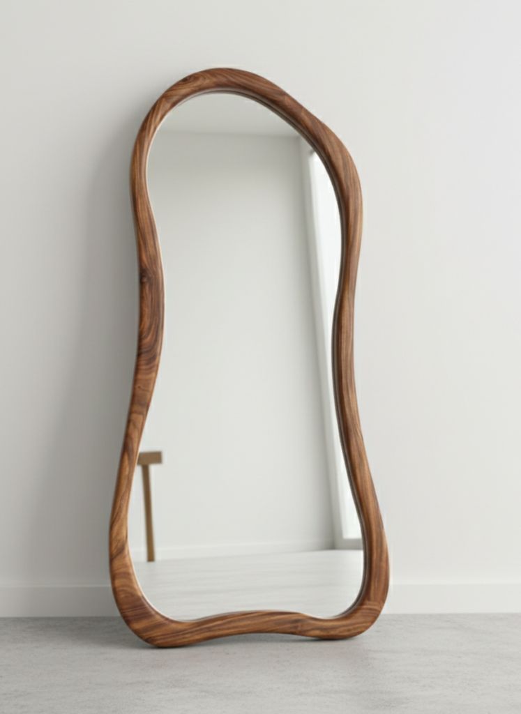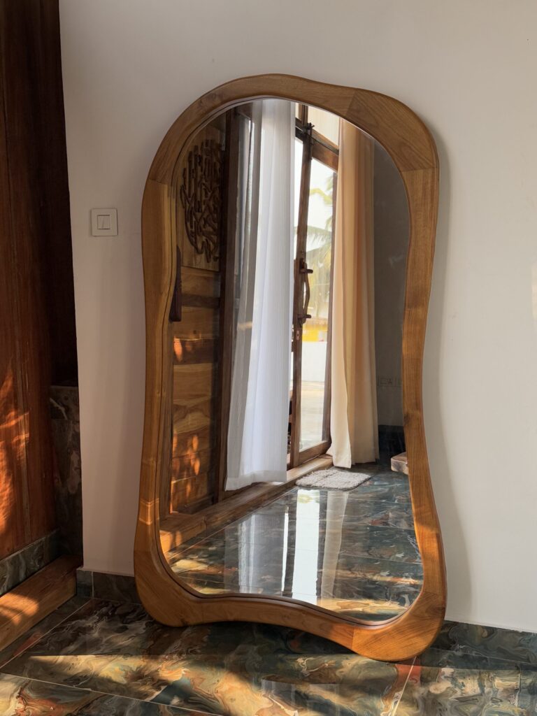 The Trifold Vanity Teak Mirror is designed for those who value both functionality and timeless aesthetics. Made from high-quality teak wood, it showcases a rich natural grain with a smooth matte finish that enhances its premium look. The three-panel folding structure allows flexible positioning, making it perfect for dressing, styling, or enhancing room depth. Its sturdy frame ensures durability while maintaining a clean, minimal design that fits effortlessly into modern and traditional interiors. Measuring 3 x 2.5 feet, this mirror is ideal for bedrooms, dressing areas, or entryways, adding both practicality and a refined visual statement to your space.