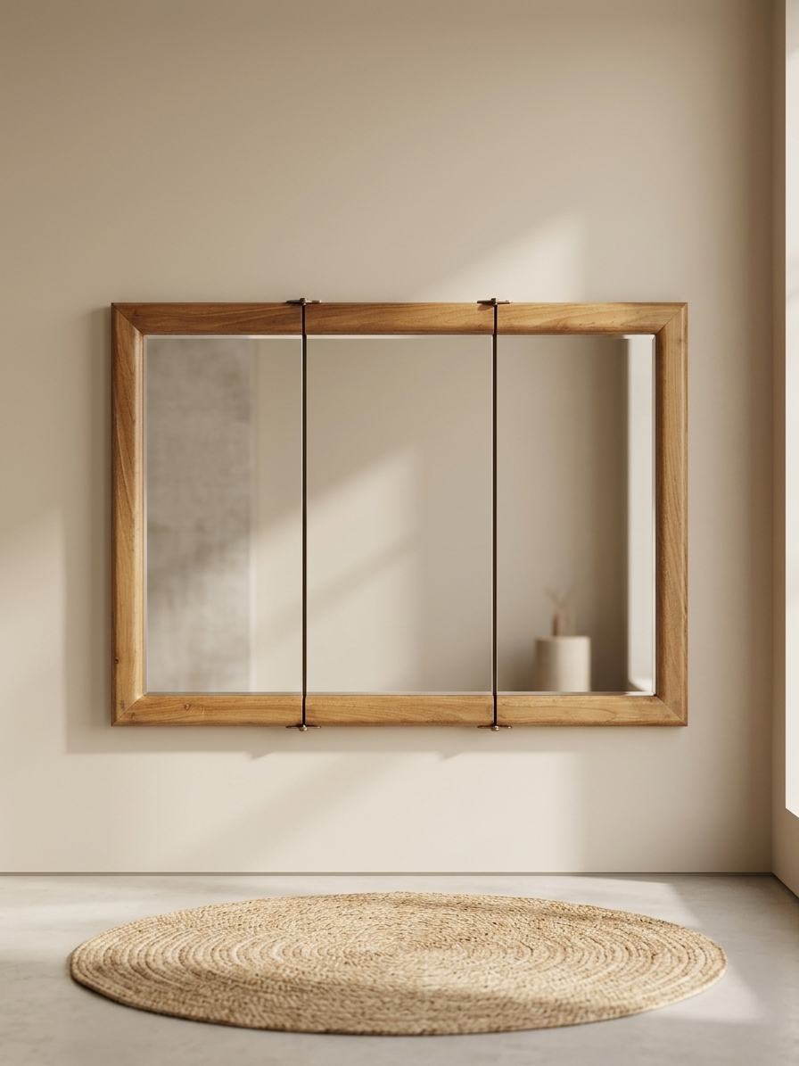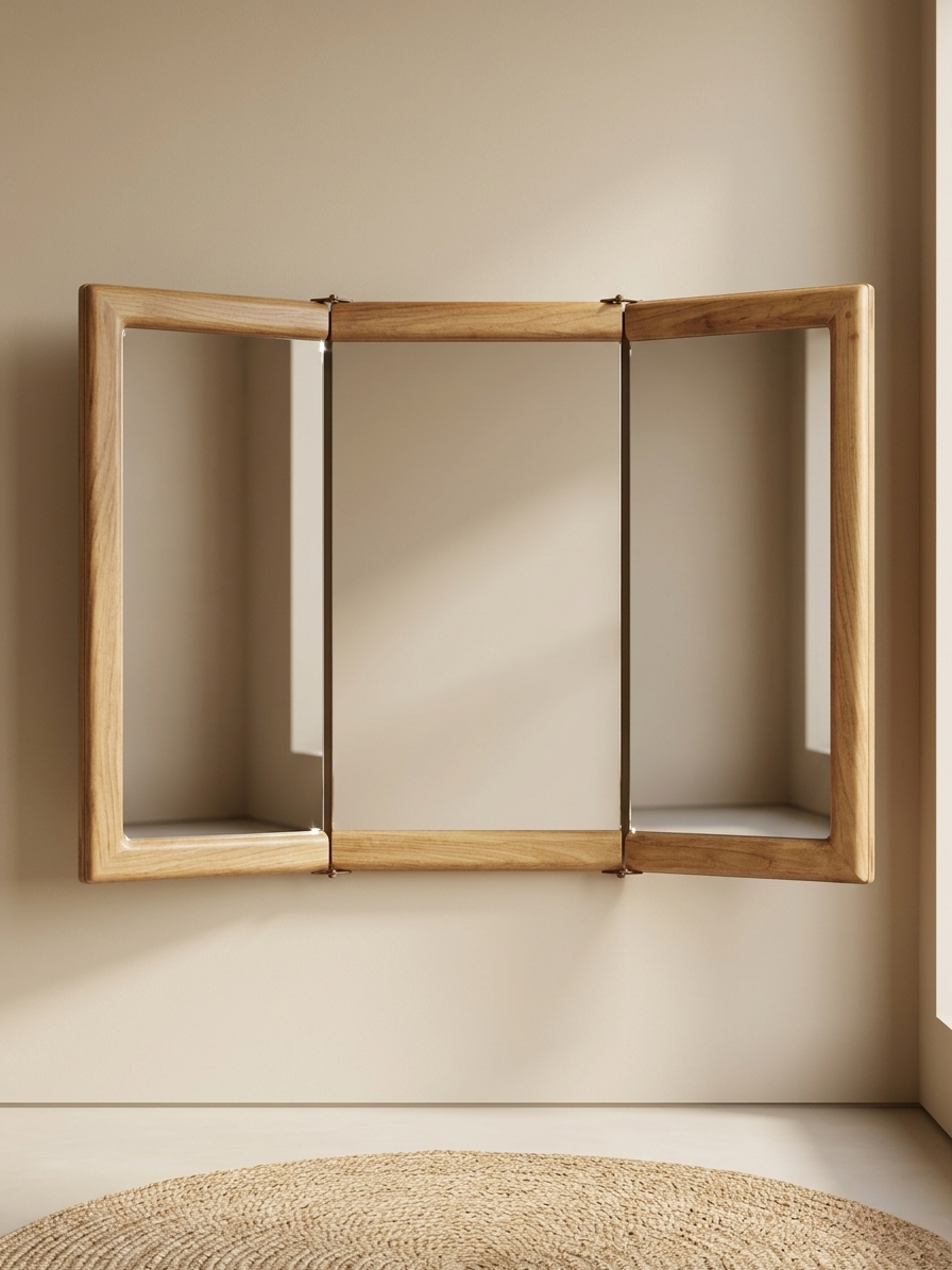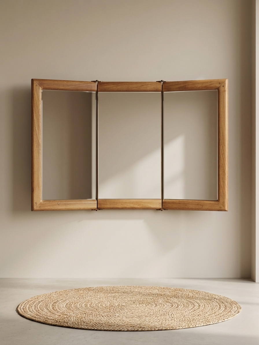 Crafted from premium teak wood, the Trifold Teak Vanity Mirror features a sleek matte finish and a practical three-panel folding design.