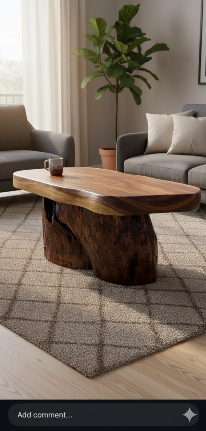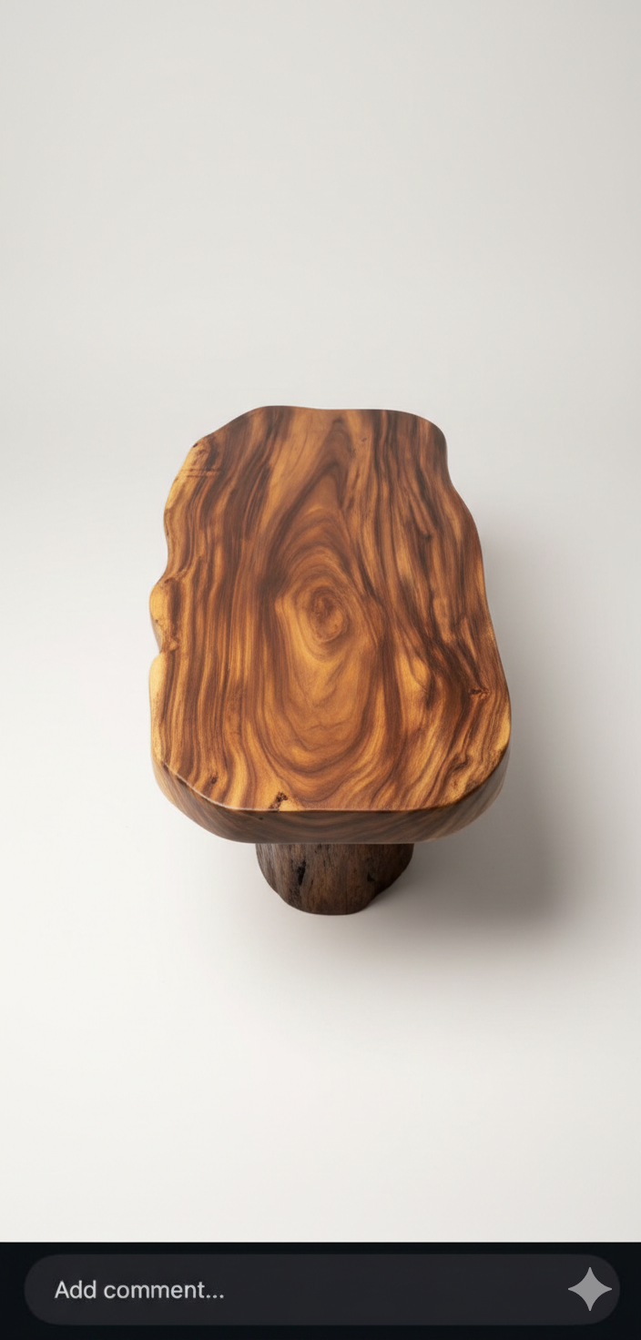 The Monkeypod Trunk Base Coffee Table is a handcrafted solid wood centerpiece designed to highlight the raw beauty and character of natural timber. Made from premium Monkeypod wood, the table features an organically shaped slab top that preserves the wood’s flowing grain and natural contours, ensuring every piece remains visually unique. Its distinctive trunk-style solid wooden base creates a strong sculptural foundation, adding depth, stability, and a grounded natural aesthetic. The smooth matte finish protects the surface while maintaining the authentic warmth and tactile feel of the wood. With a practical 92 × 61 cm tabletop and a comfortable 46 cm height, this coffee table works perfectly as a living room centerpiece, lounge table, or statement feature in contemporary, rustic, or organic modern interiors where solid wood craftsmanship takes focus.