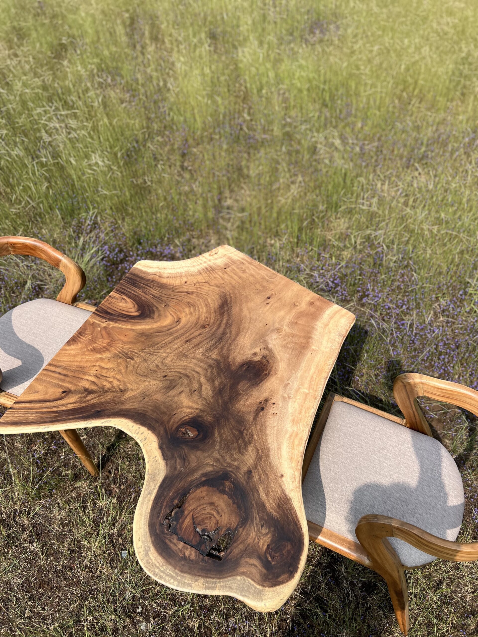 A solid Monkeypod wood freeform live-edge table with an organic slab top and matte finish. Designed as a compact statement table for coffee seating, balconies, or designer interiors.