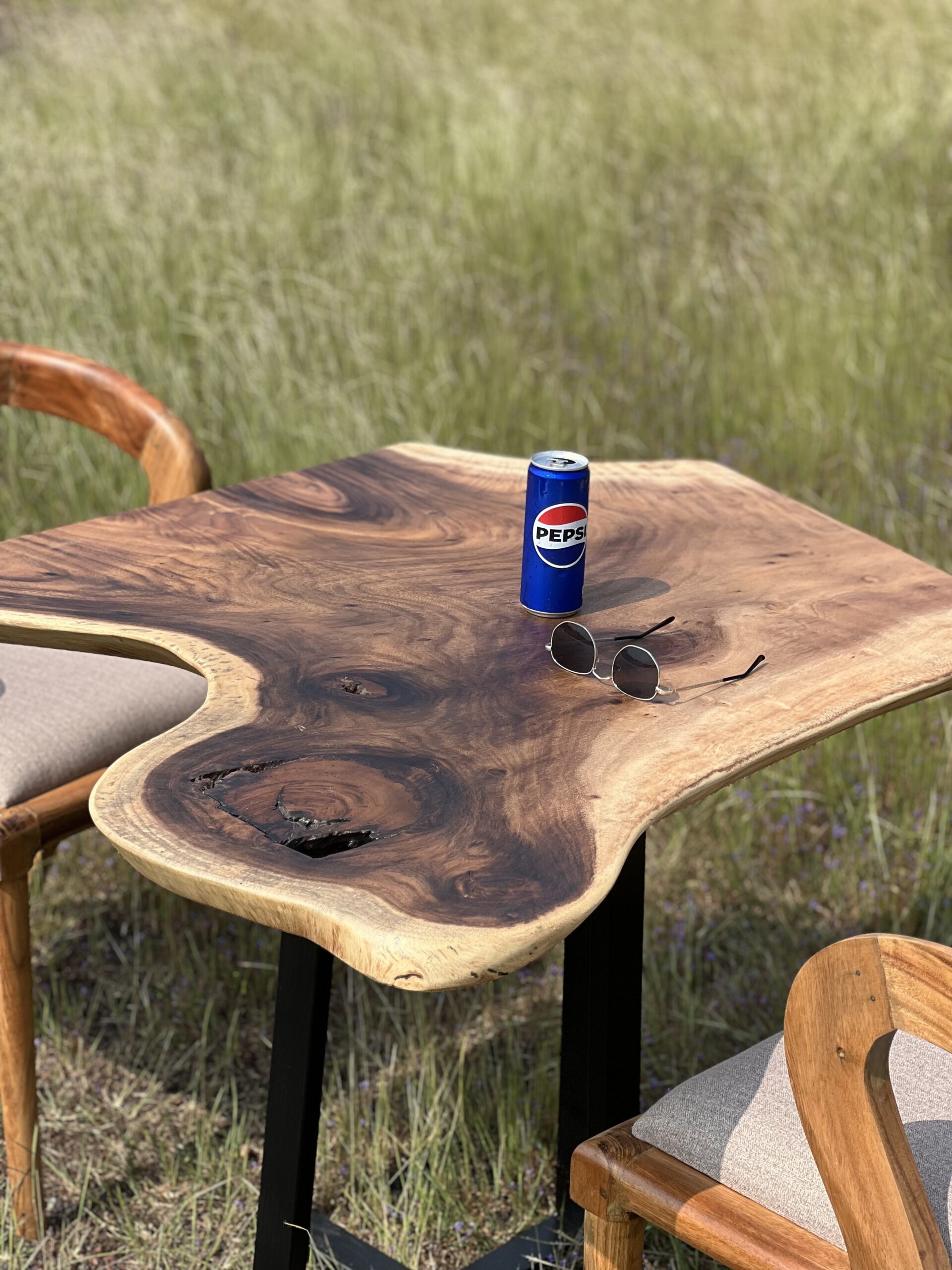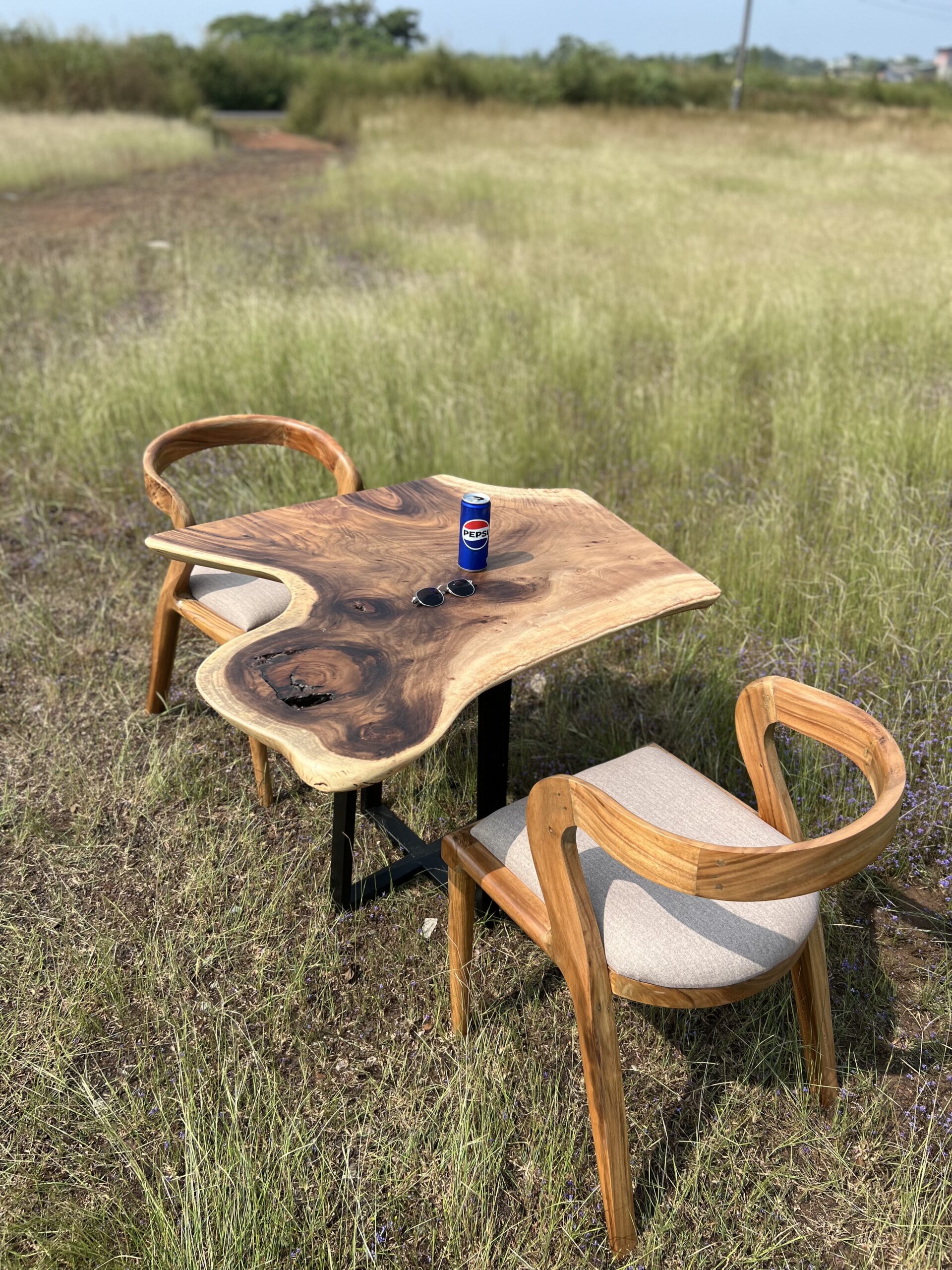 The Solid Monkeypod Wood Freeform Live Edge Table is a handcrafted slab table created to highlight the natural beauty of raw timber. Made from premium solid Monkeypod wood, the tabletop preserves its organic contours, grain movement, and natural edge flow — ensuring every piece is completely unique. Sized at approximately 92 × 92 cm (around 3 ft), the table works well as a coffee table, compact dining table, or accent piece for balconies and lounge spaces. The matte finish enhances the natural tone and texture of the wood while maintaining a smooth, usable surface. Supported by a sturdy base, this table is ideal for homes, villas, cafés, and designer interiors seeking authentic material character and handcrafted quality.